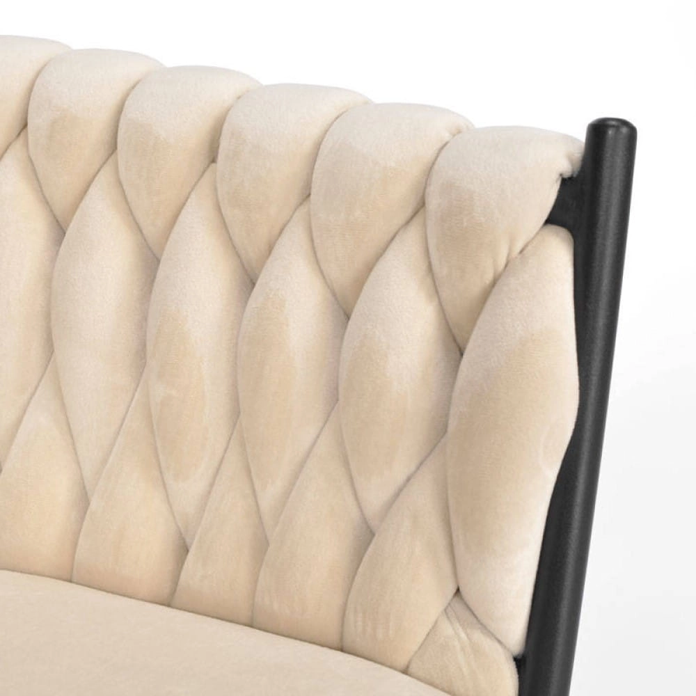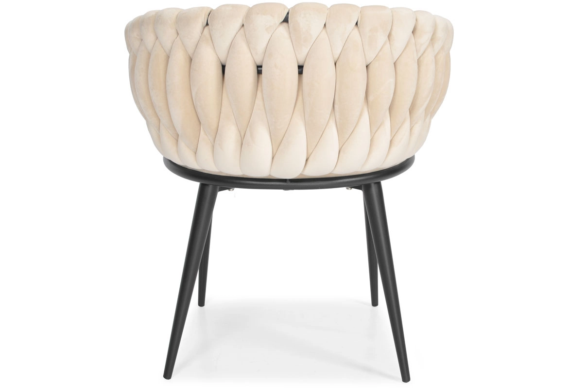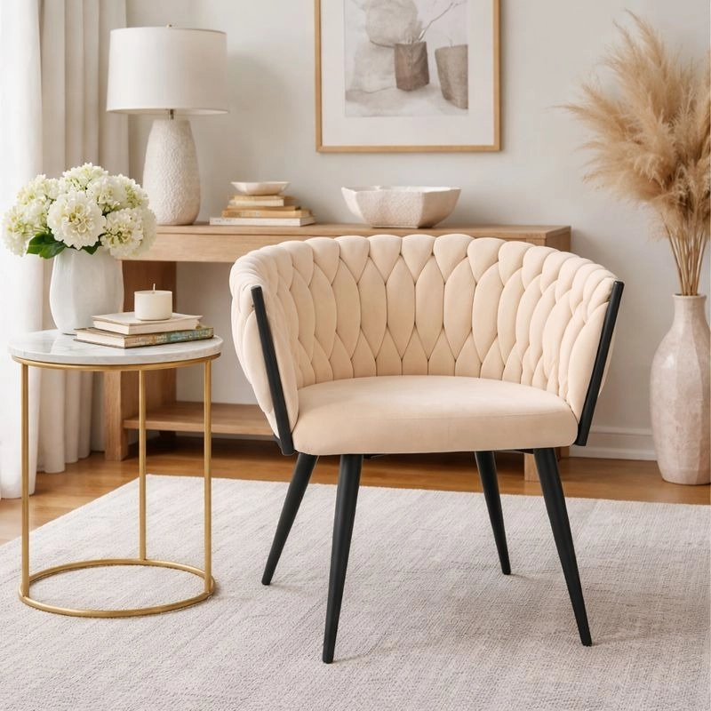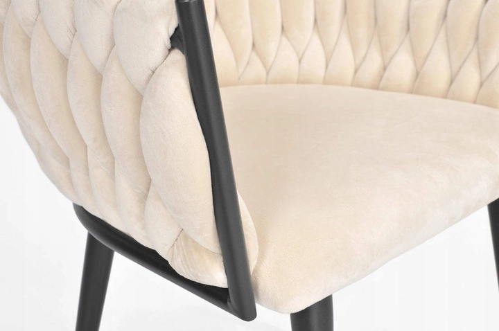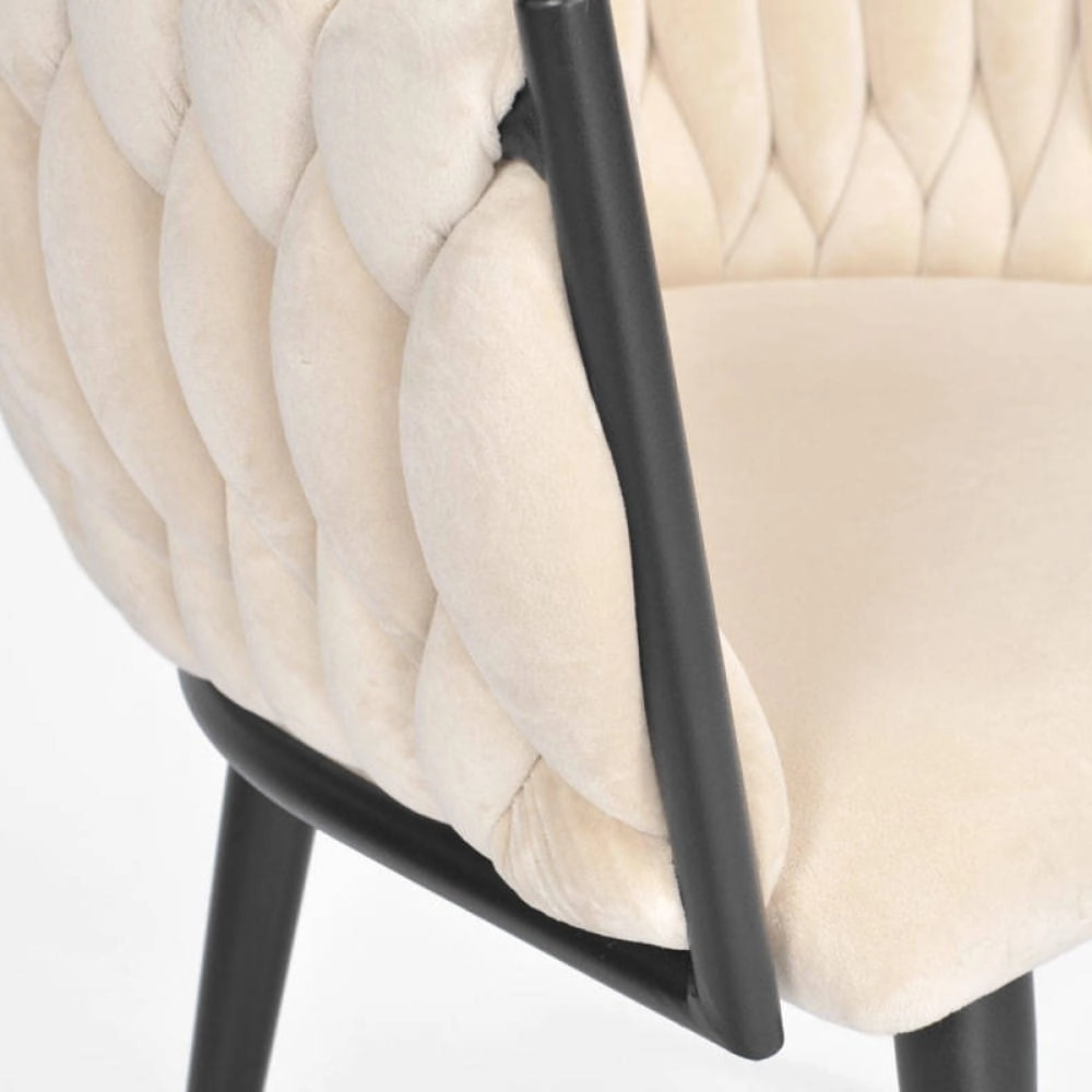 Elegancki aksamitny fotel w beżowym kolorze łączy luksusowy wygląd, nowoczesną plecioną tapicerkę oraz stabilne czarne metalowe nogi. Kokonowy kształt z podłokietnikami zapewnia wysoki komfort przy stole jadalnianym i w salonie, a dzięki plecionemu oparciu 3D nadaje wnętrzu wyrazisty efekt „wow”.