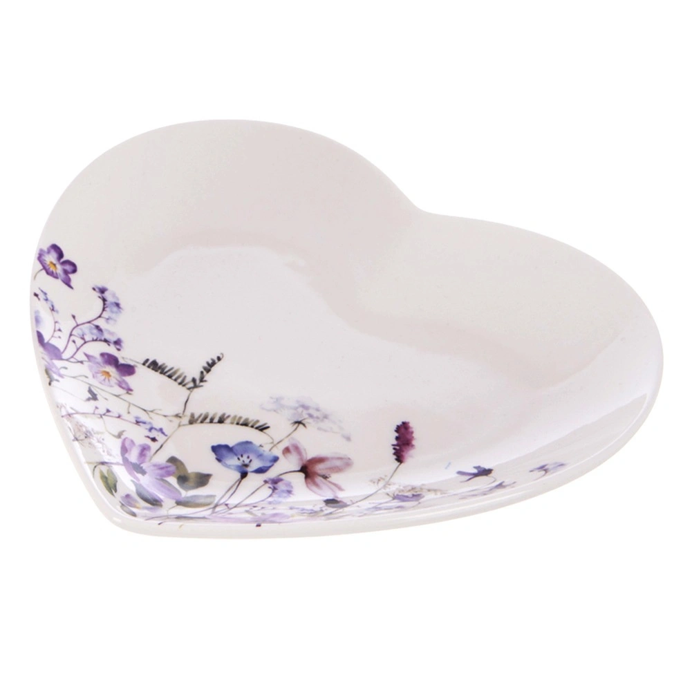 Elegancki porcelanowy talerz w kształcie serca z kolekcji LOUKA jest idealny do serwowania deserów, słodkości oraz małych przekąsek. Wykonany z wysokiej jakości porcelany z delikatnym kwiatowym dekorem, nadaje się do zmywarki i kuchenki mikrofalowej, doskonale dopełniając każdy stół.