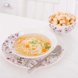 Dzięki odpowiedniej głębokości i pojemności 600 ml wygodnie podasz zupy, kremy, makarony lub musli. Wysokiej jakości porcelana jest trwała i łatwa w utrzymaniu – talerz można myć w zmywarce i używać w kuchence mikrofalowej. Klasyczny okrągły kształt oraz kwiatowy motyw łatwo skomponujesz z innymi elementami zastawy.