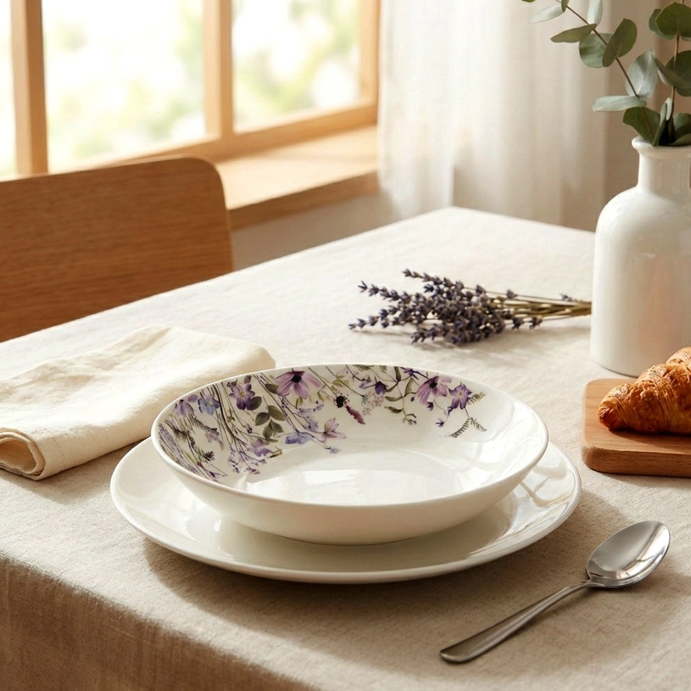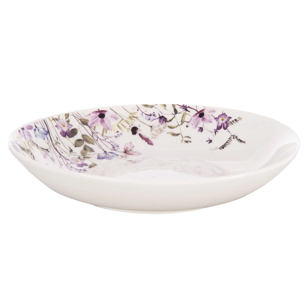 Elegancki głęboki talerz z porcelany z dekoracyjnym wzorem łąkowych kwiatów jest idealny na co dzień i na uroczyste okazje. Dzięki średnicy 20,5 cm i pojemności 600 ml świetnie sprawdzi się do zup, makaronów i sałatek. Porcelana zapewnia długą żywotność, talerz jest odpowiedni do zmywarki i kuchenki mikrofalowej, a elegancki design ozdobi każdy stół.