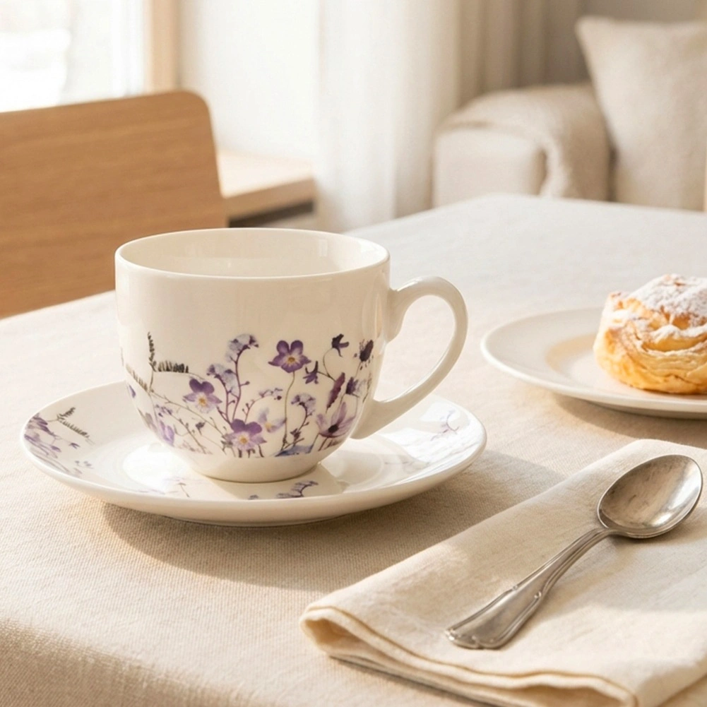 Praktyczny kształt z ergonomicznym uchem zapewnia wygodne picie, a spodek stanowi stabilną i elegancką podstawę. Wysokiej jakości porcelana jest odporna na codzienne użytkowanie i umożliwia łatwe mycie w zmywarce oraz szybkie podgrzewanie w mikrofalówce.