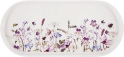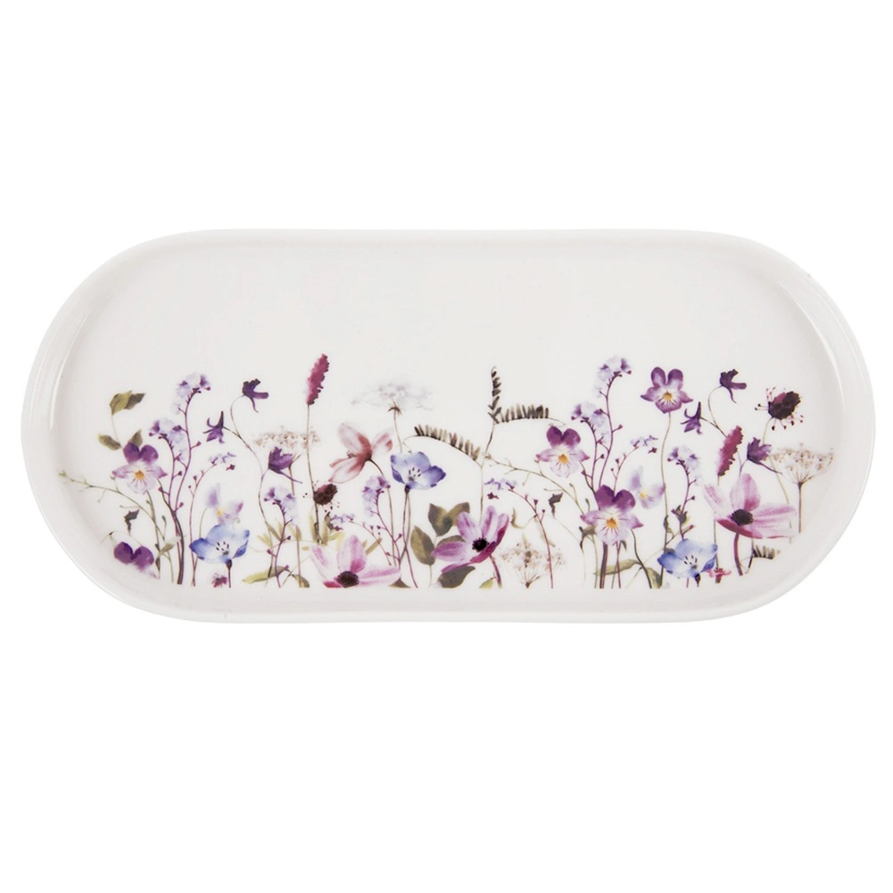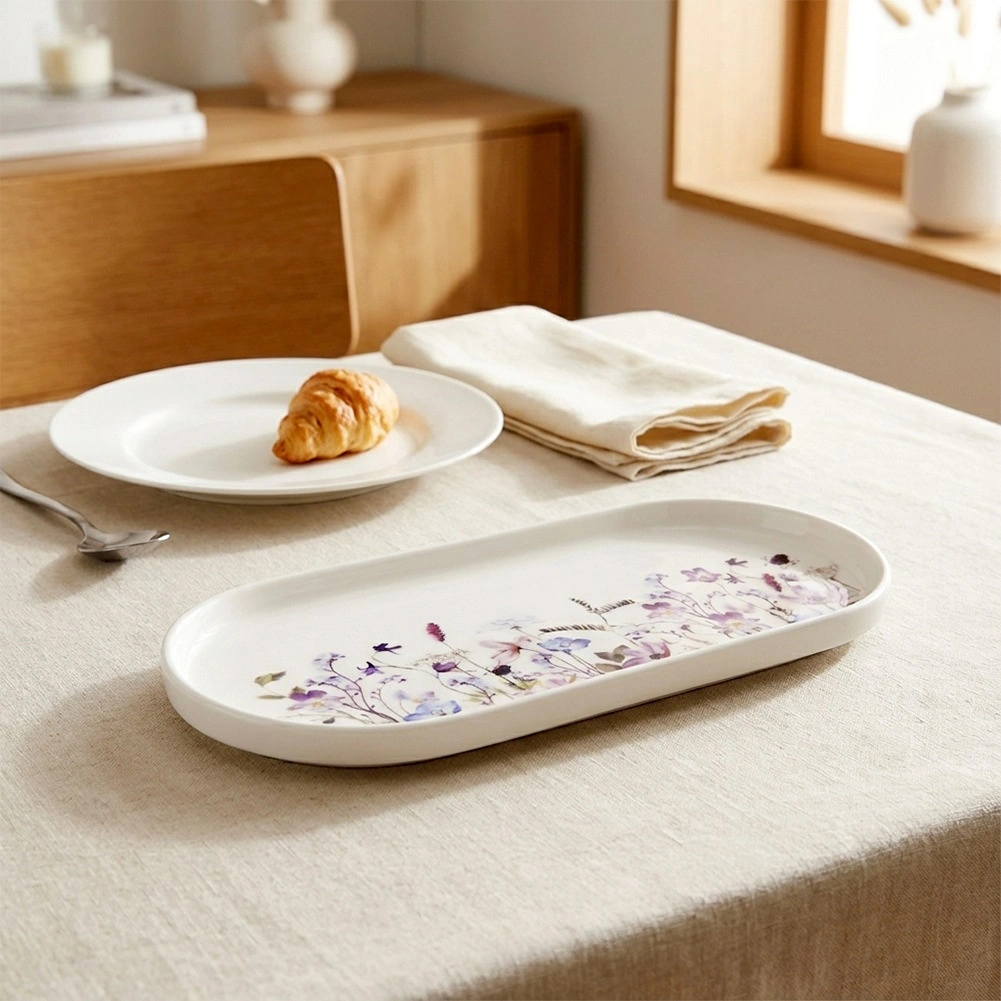 Elegancki owalny porcelanowy talerz z motywem łąkowych kwiatów jest idealny do serwowania przystawek, deserów i przekąsek. Dzięki wymiarom 25 × 12 cm oraz lekko podwyższonemu rantowi wygląda stylowo, a jednocześnie jest praktyczny. Można myć w zmywarce i używać w kuchence mikrofalowej, wysokiej jakości porcelana oraz nowoczesny kwiatowy design czynią z niego świetny wybór na co dzień i na odświętny stół.