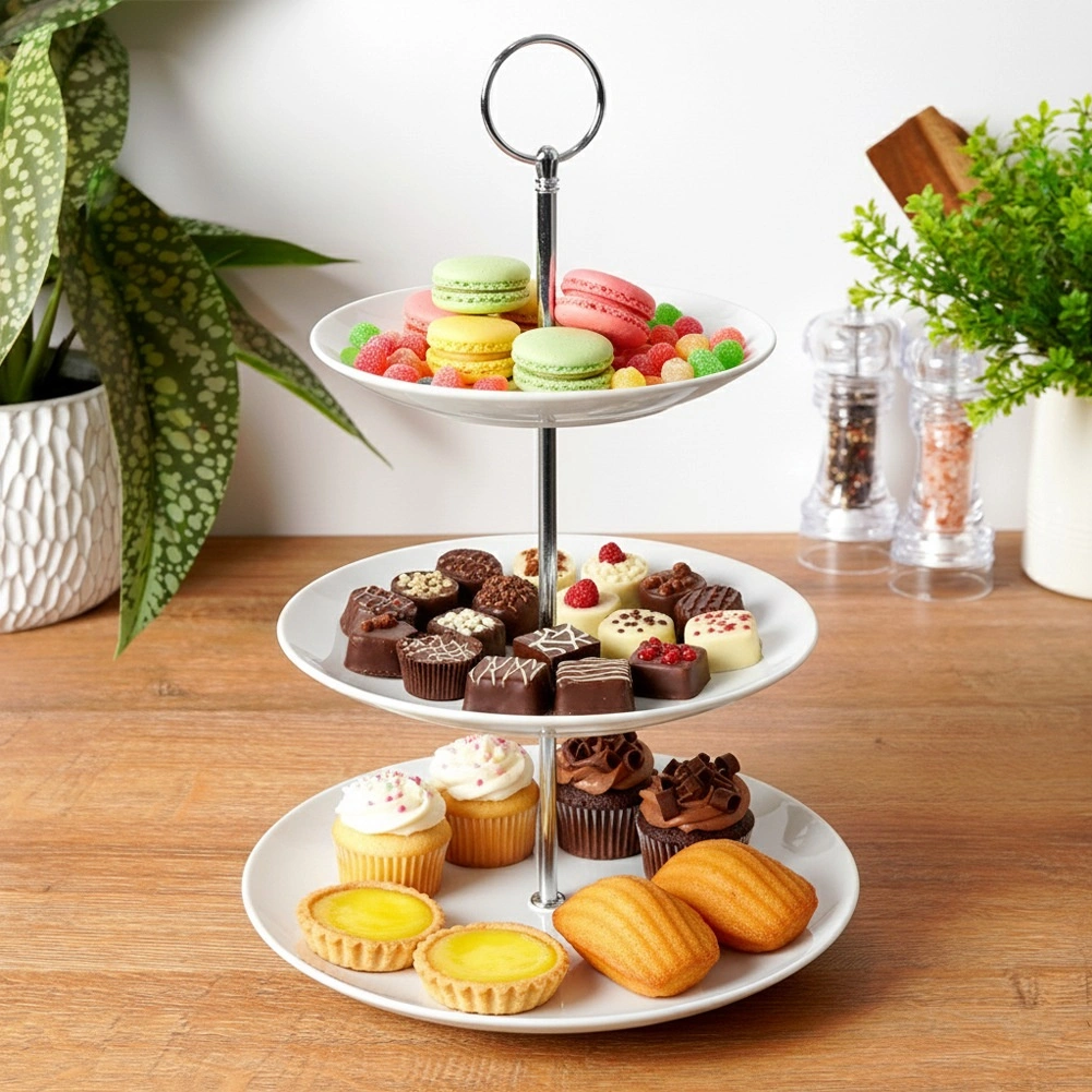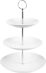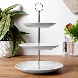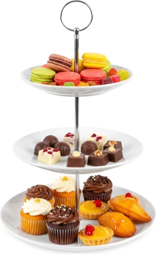 Trzy okrągłe talerze o średnicy około 25, 20 i 15 cm zapewniają dużo miejsca na desery, owoce i kanapki, a jednocześnie oszczędzają przestrzeń na stole.