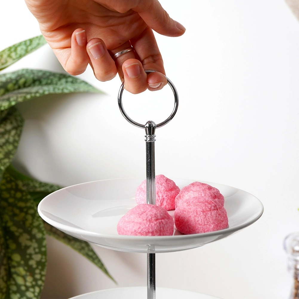 Centralny metalowy pręt z praktycznym kółkiem umożliwia bezpieczne i wygodne przenoszenie całej etażerki między miejscami serwowania.