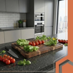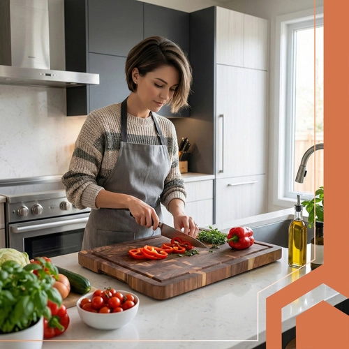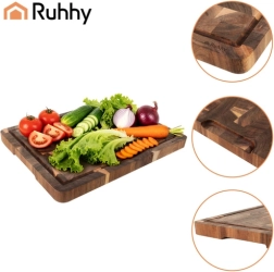 Mastywna grubość 3 cm stabilnie trzyma deskę na miejscu, a rowek obwodowy zatrzymuje płyny z mięsa i warzyw, utrzymując powierzchnię roboczą w czystości. Dolne uchwyty umożliwiają bezpieczne przenoszenie i wygodne serwowanie prosto na stół.