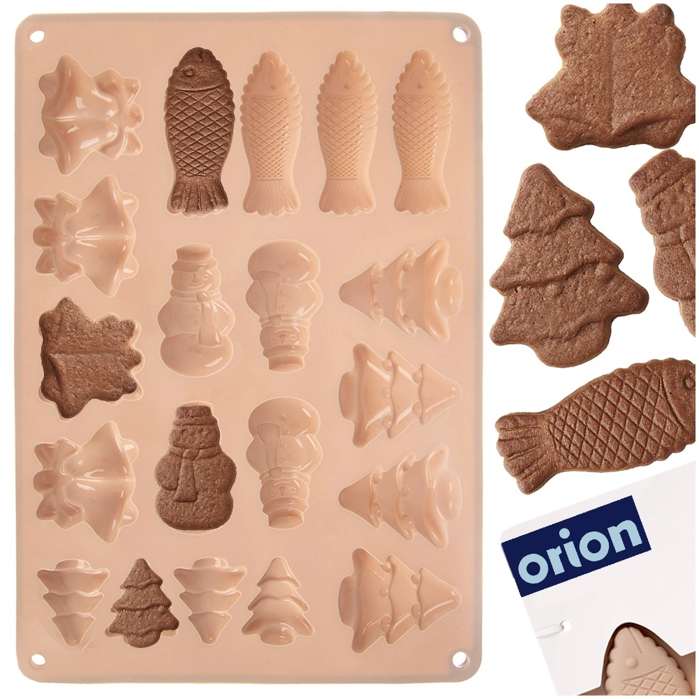 Praktyczna silikonowa forma do pieczenia i chłodzenia pozwala przygotować aż 20 sztuk słodkości w pięciu zimowych motywach – choinka, dzwonek, bałwan i ryba. Dzięki elastycznemu silikonowi kształty łatwo się wyjmuje, nic się nie przywiera, a forma jest odpowiednia do piekarnika, kuchenki mikrofalowej i zamrażarki. Dodatkowo można ją łatwo umyć w zmywarce.