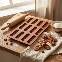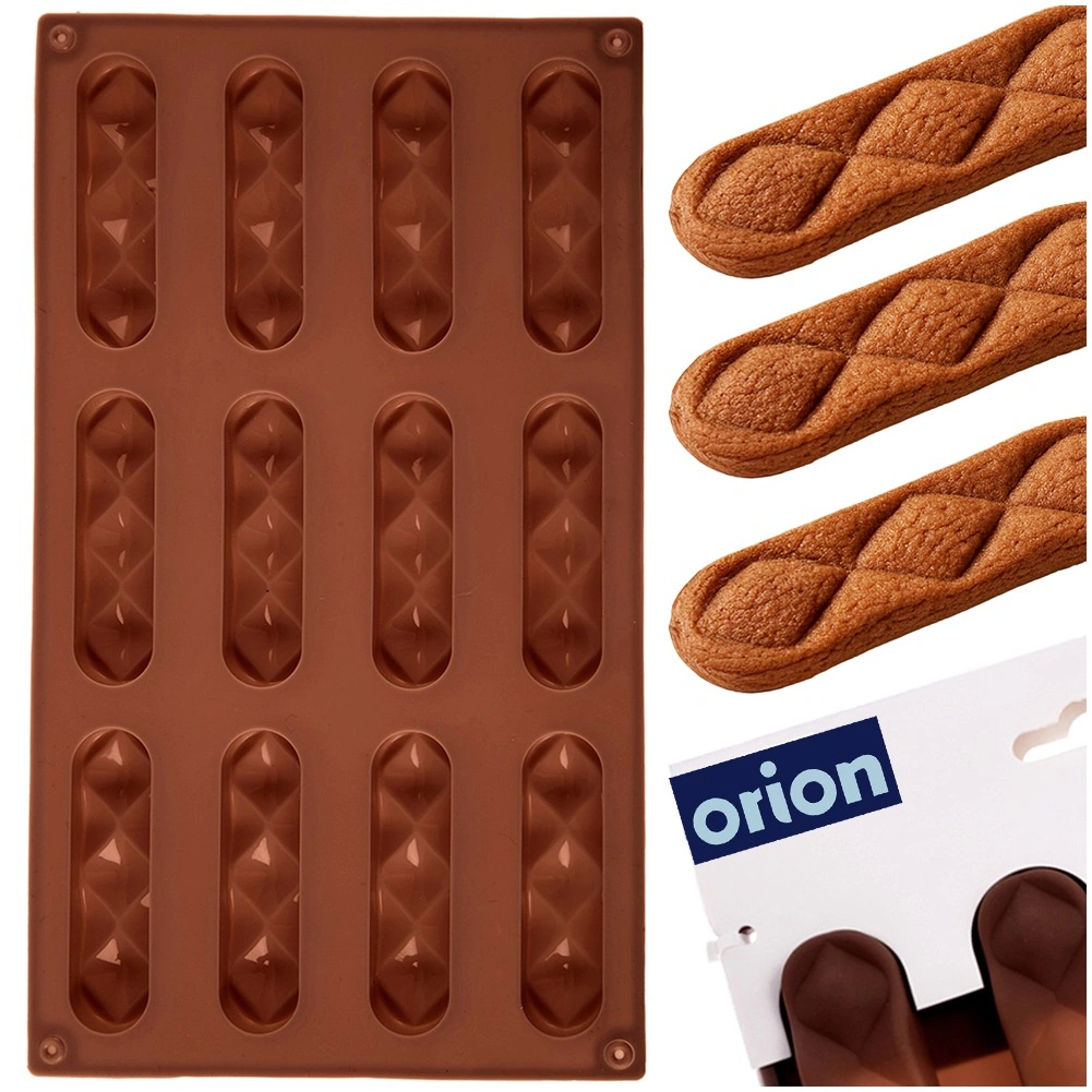 Z tą wysokiej jakości silikonową formą przygotujesz kruche ciastka oraz domowe praliny w eleganckim podłużnym kształcie. Jedna porcja mieści 12 sztuk o wymiarach około 8 × 2 × 1 cm, które dzięki nieprzywierającej powierzchni łatwo wyjąć bez łamania. Forma zapewnia równomierne wypiekanie oraz piękny dekor z diamentowym wzorem.