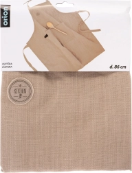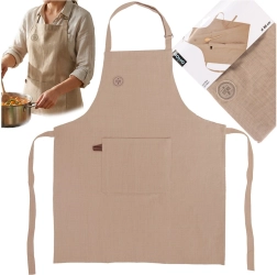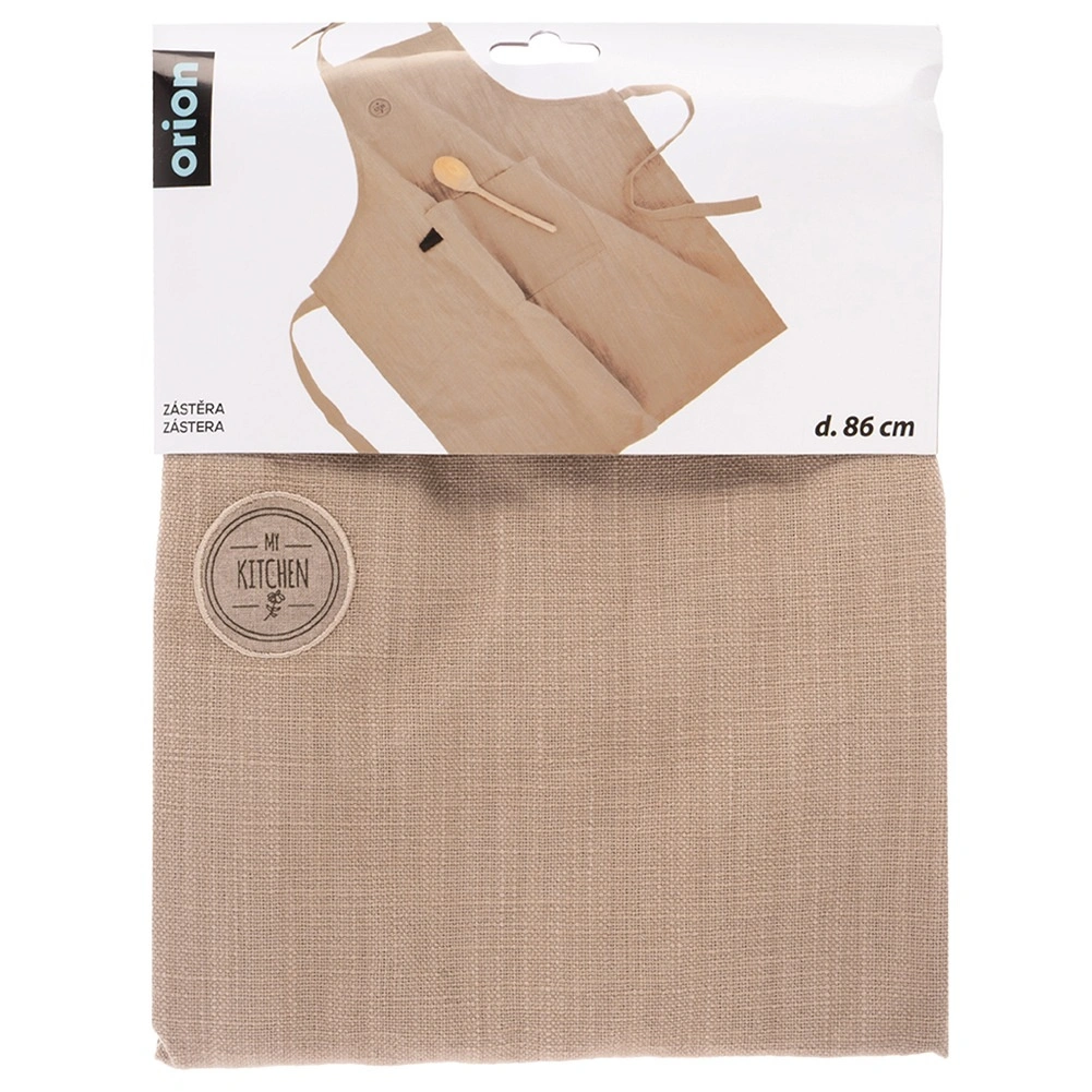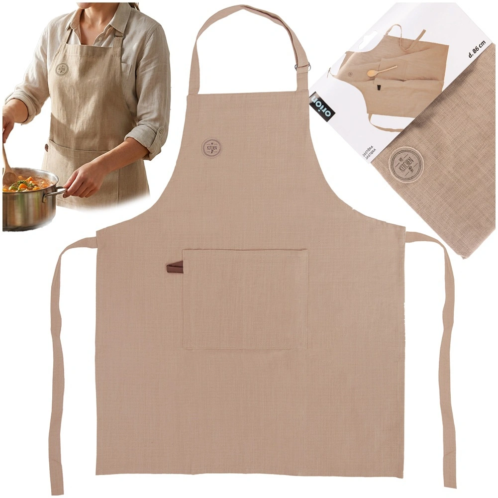 Praktyczny fartuch kuchenny z 100% bawełny w beżowym kolorze chroni ubranie podczas gotowania, pieczenia i grillowania. Dzięki regulowanemu paskowi na szyję oraz długim wiązań w pasie łatwo dopasowuje się do każdej sylwetki. Duża przednia kieszeń utrzyma pod ręką przepis, przyprawy i drobne akcesoria. Można prać w temperaturze do 40 °C.