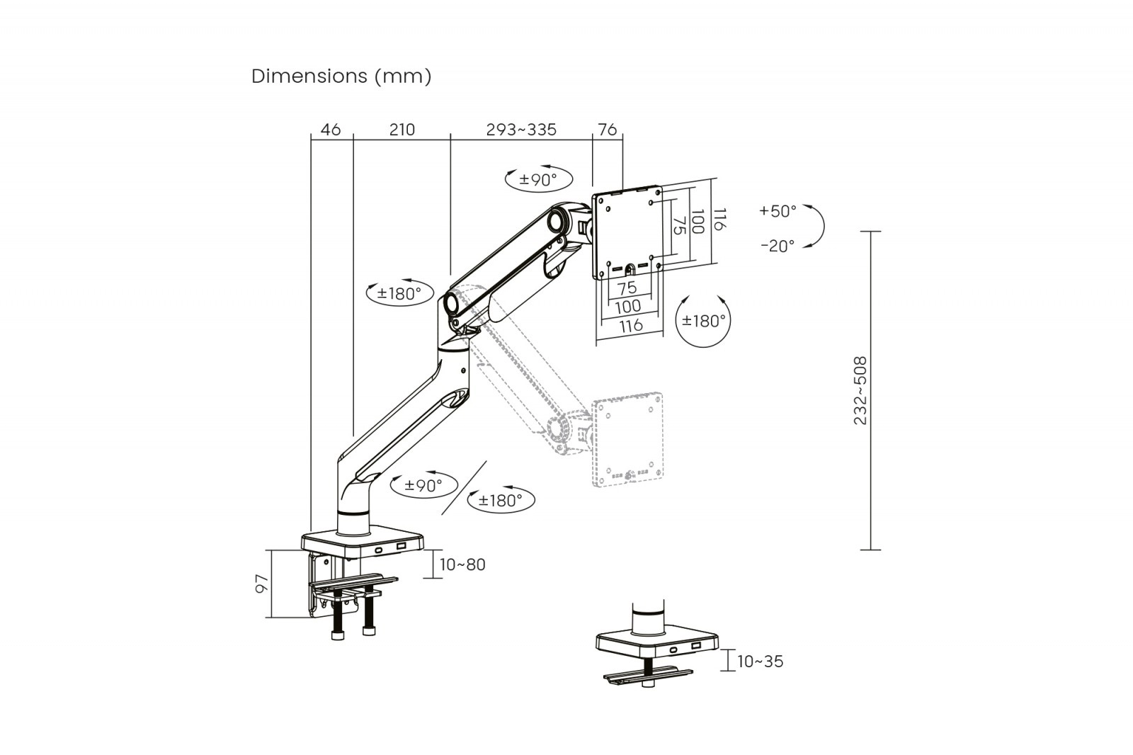 Wybierz zacisk lub przepust w zależności od typu biurka. Ogranicznik 180° chroni przed uderzeniem w ścianę lub sąsiednie ekrany.