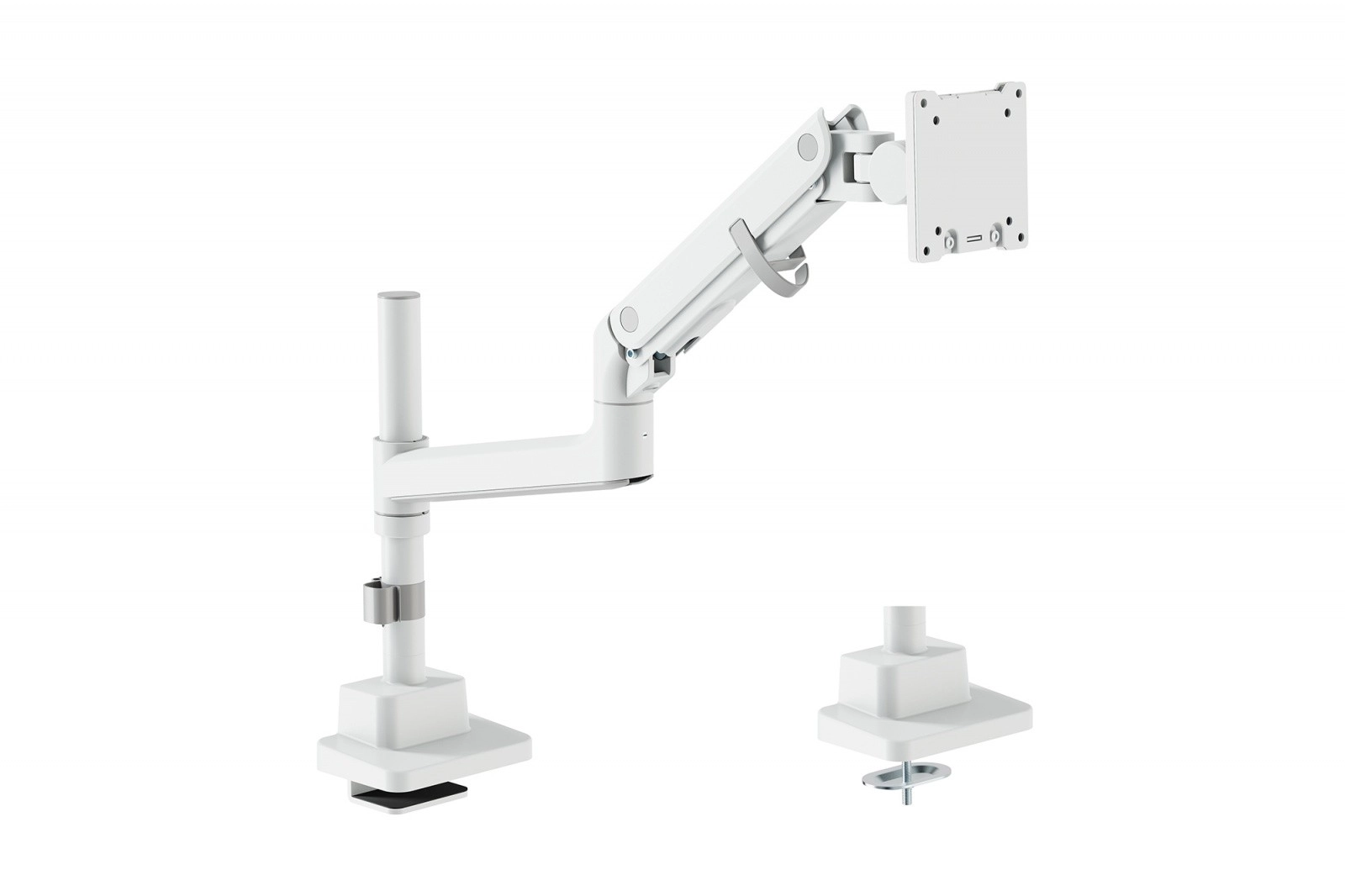 Montaż jest szybki i bezpieczny: ramię można zamocować imadłem do blatu lub przez przelotkę, a VESA Quick-Release oszczędza czas przy zakładaniu lub zdejmowaniu monitora. Zintegrowane prowadzenie kabli utrzymuje porządek na biurku. Dodatkowy adapter słupkowy rozszerza możliwości regulacji, aby pozycja ekranu była zawsze perfekcyjna.
