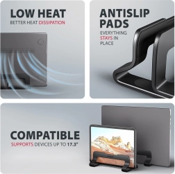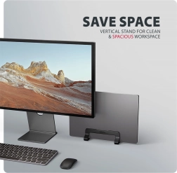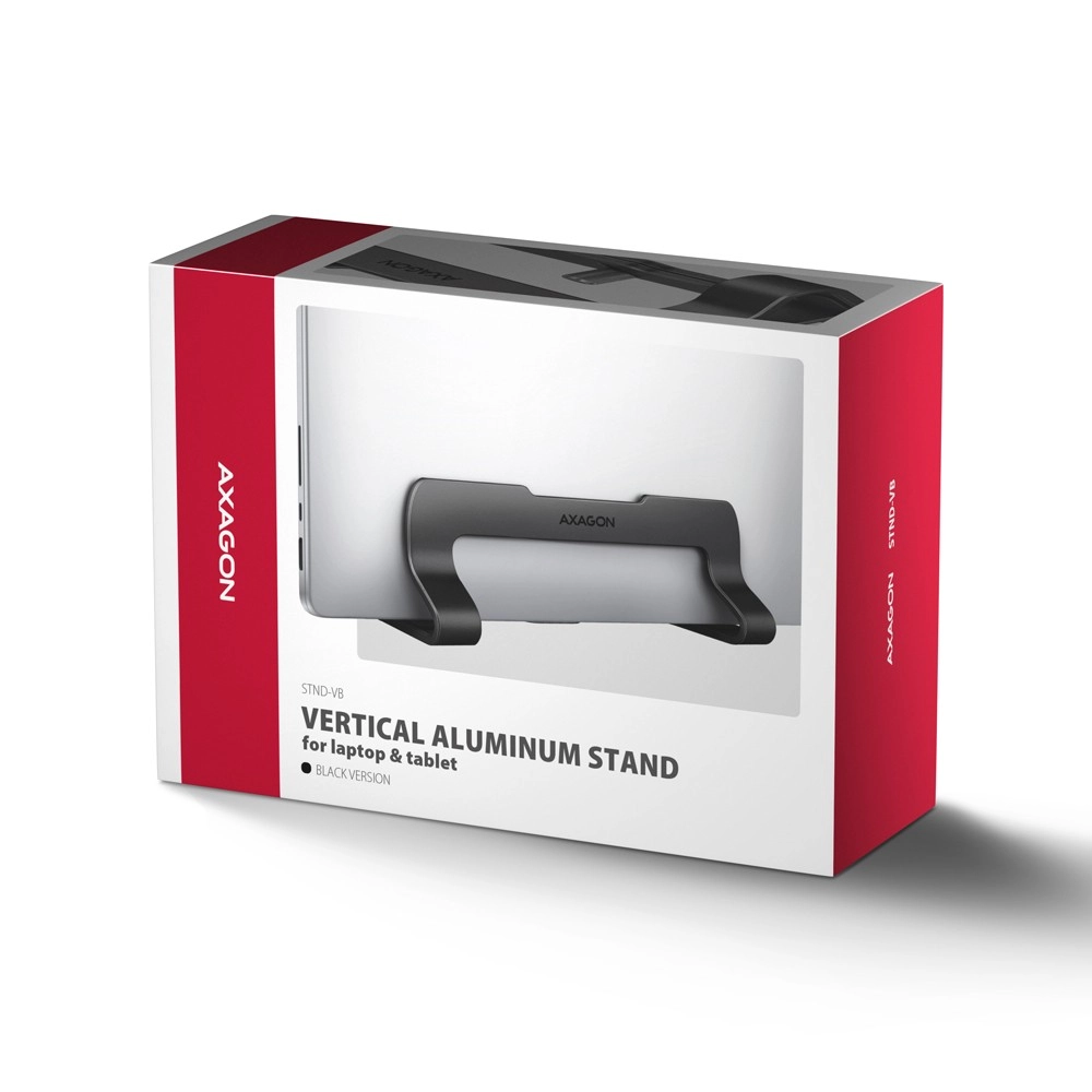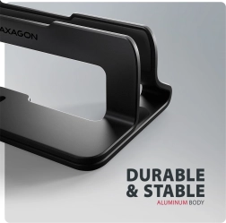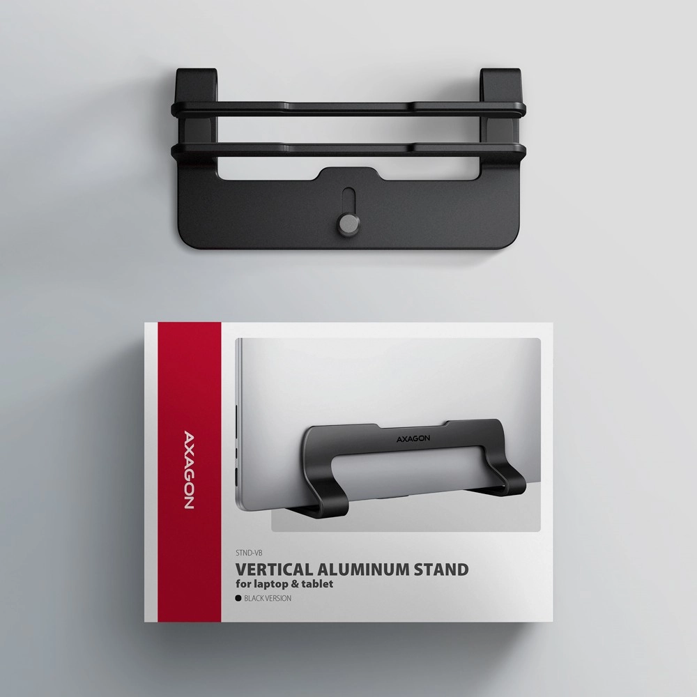 Elegancki i praktyczny stojak AXAGON STND-VB umożliwia pionowe przechowywanie laptopa lub tabletu i zwalnia miejsce na biurku. Dzięki regulowanej szerokości 9,5–25,5 mm pasuje do większości urządzeń o przekątnej 10–17,3". Solidna aluminiowa konstrukcja z powierzchnią antypoślizgową zapewnia stabilność, chroni przed zarysowaniami i pomaga poprawić chłodzenie dla dłuższej żywotności laptopa.