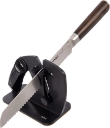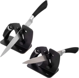 Sprężynowy mechanizm sam dopasowuje się do ostrza i utrzymuje właściwy kąt dla spójnego i delikatnego ostrzenia noży gładkich i ząbkowanych.