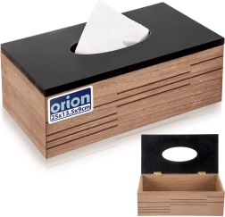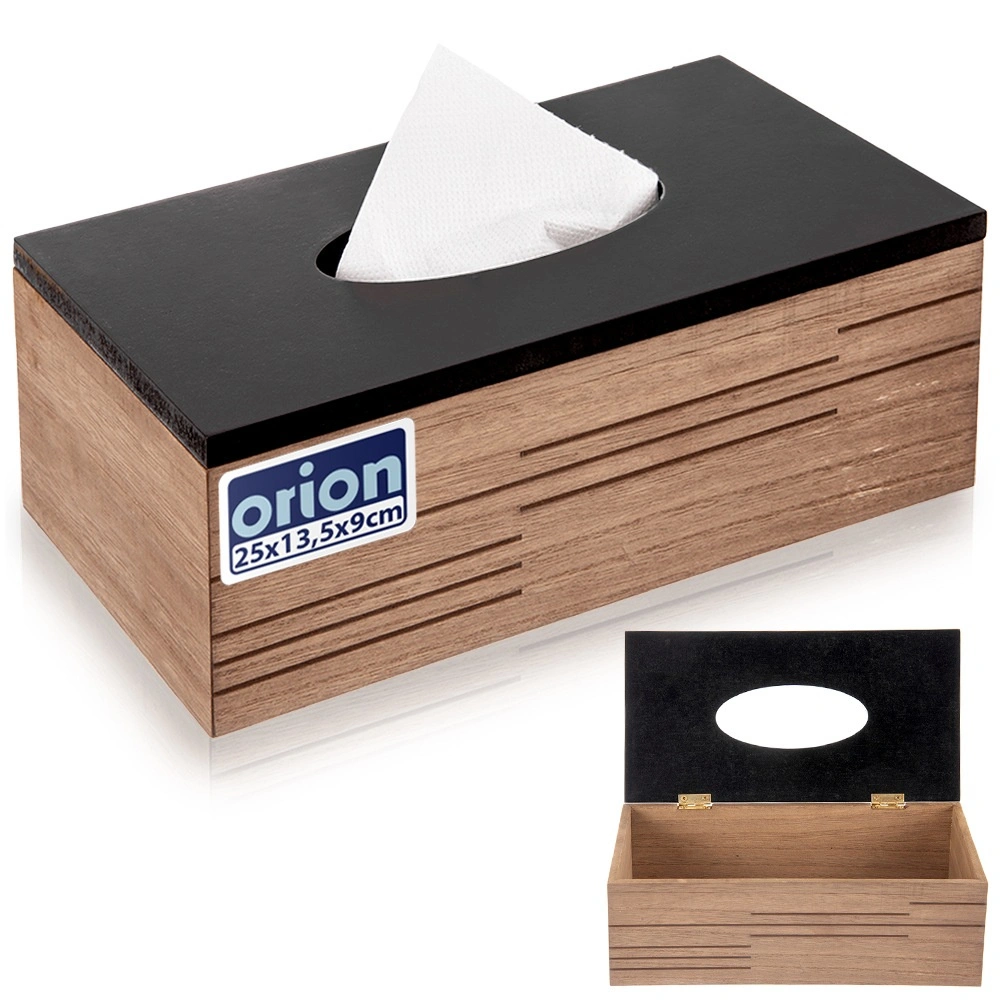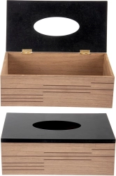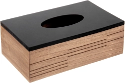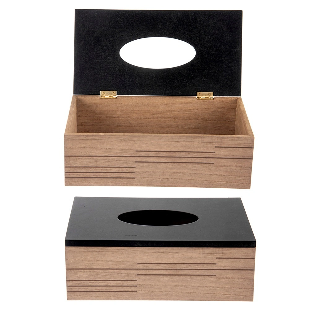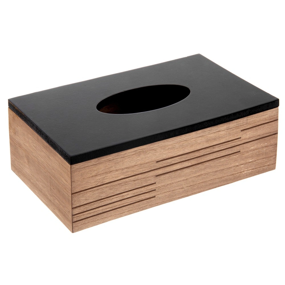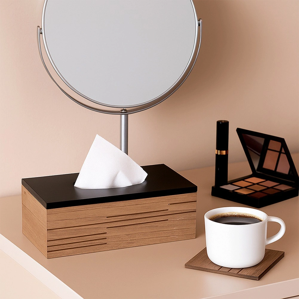 Stylowe drewniane korpus z nowoczesnymi rowkami i czarną pokrywą zmienia zwykłe chusteczki w designerski dodatek.