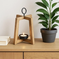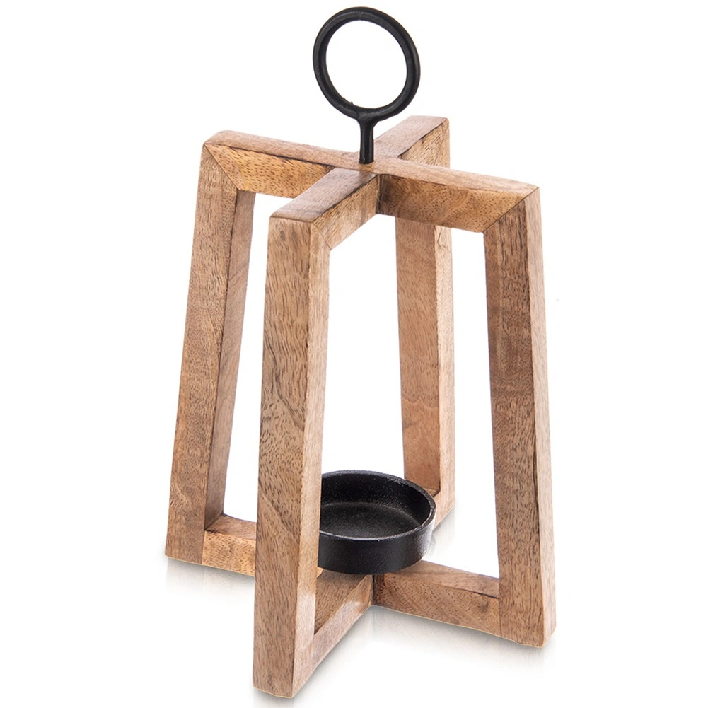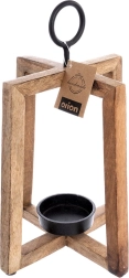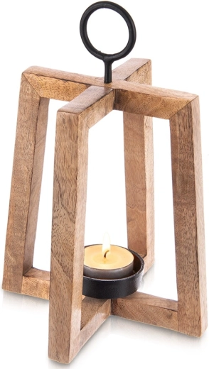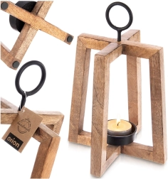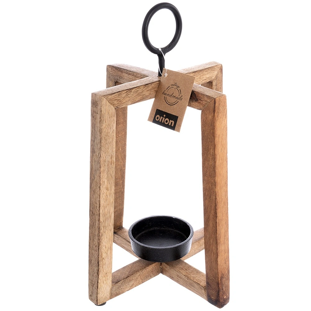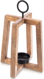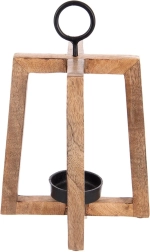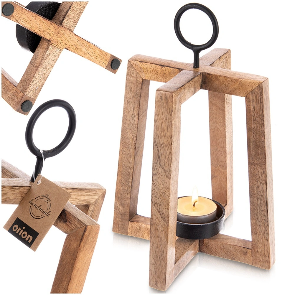 Stylowy drewniany świecznik z drewna mango o otwartej konstrukcji zapewnia przyjemne, nastrojowe światło i dodaje wnętrzu oraz tarasowi naturalnego uroku. Metalowy uchwyt umożliwia zawieszenie i wygodne przenoszenie, metalowa miseczka bezpiecznie utrzymuje świeczkę/tealight o średnicy do 6 cm, a filcowe podkładki gwarantują stabilność i ochronę powierzchni. Wymiary 18 × 18 × 27,5 cm.