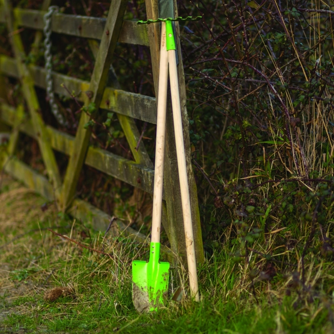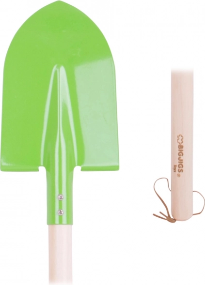 Dziecięca łopata ogrodowa z długim, drewnianym trzonkiem i wytrzymałym zielonym, metalowym ostrzem jest idealna dla małych ogrodników. Wspiera rozwój motoryki, równowagi i relacji z naturą, jest solidna, bezpieczna i doskonale leży w dziecięcej dłoni.