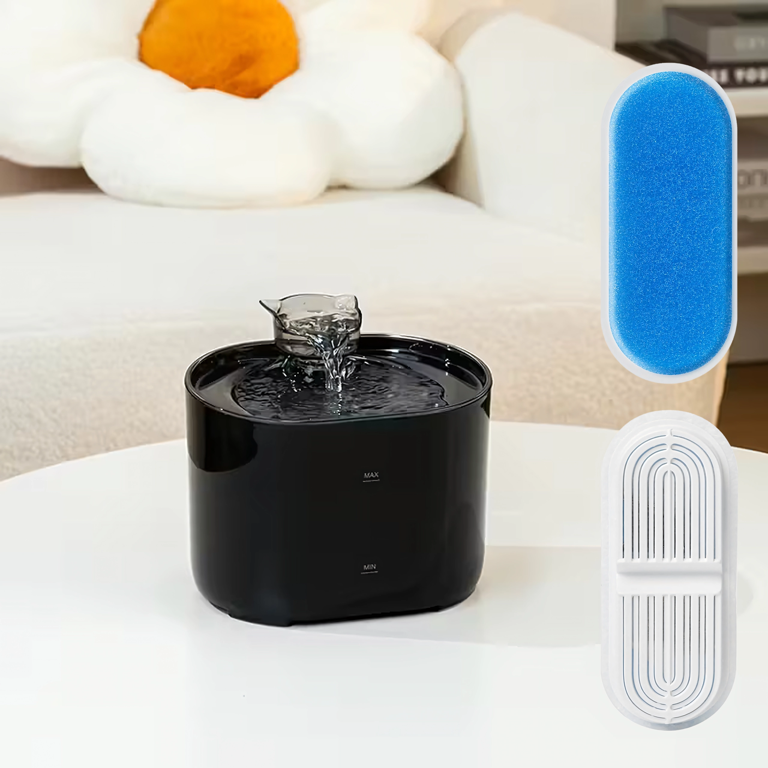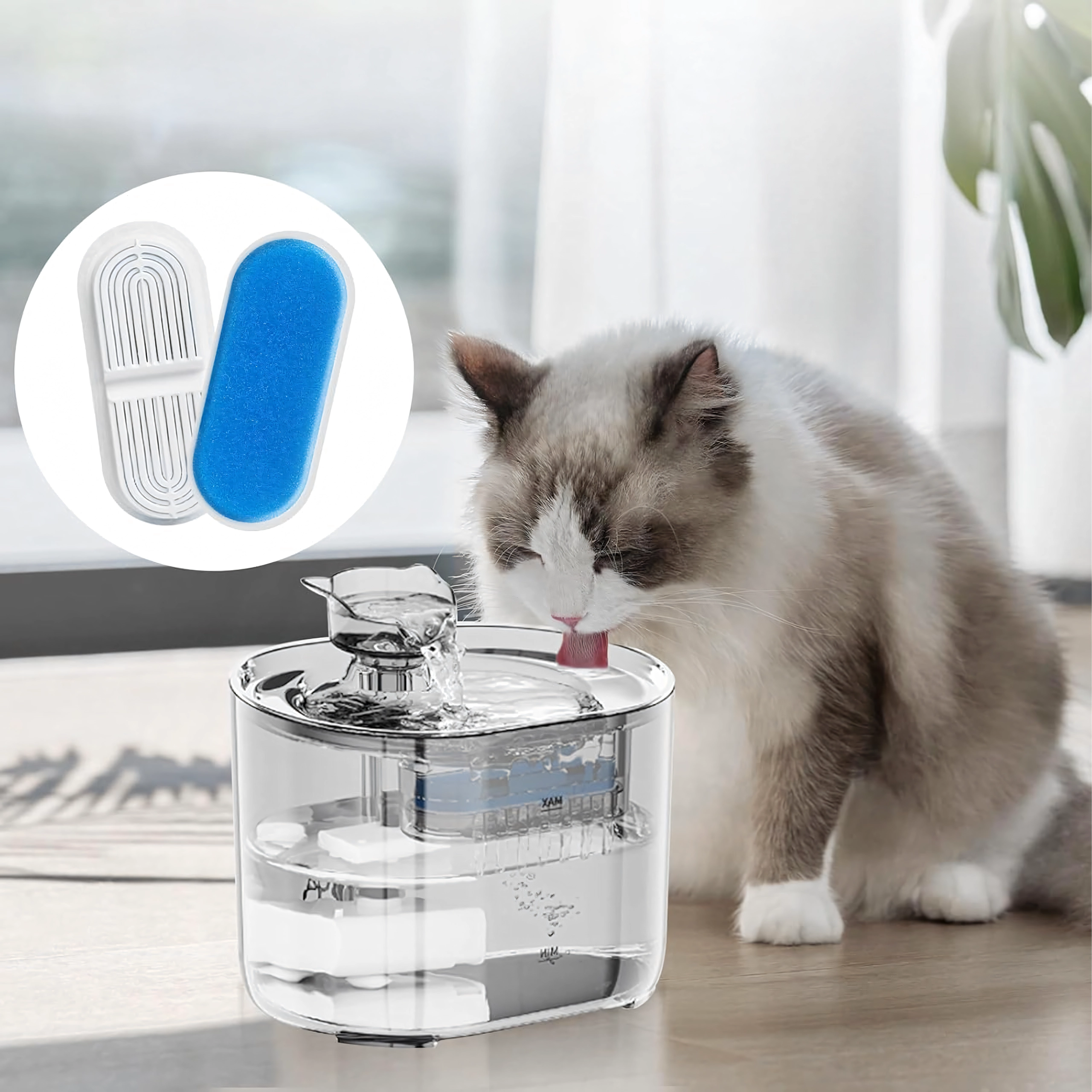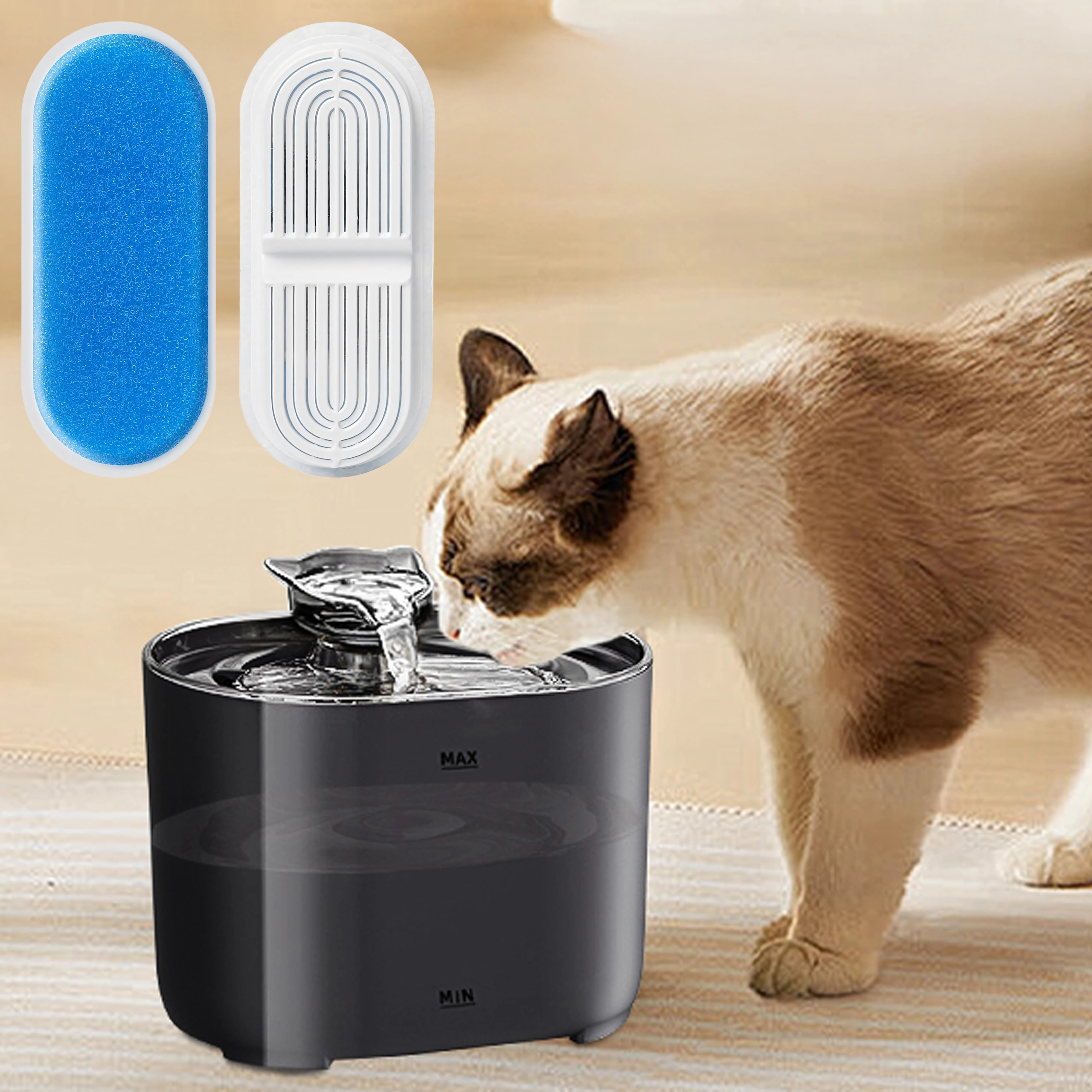 Kombinacja piankowego prefiltra i drobnej wkładki filtracyjnej skutecznie wychwytuje sierść i drobne cząstki, dzięki czemu pupil pije czystszą i smaczniejszą wodę.