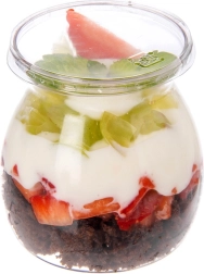 Przezroczyste ścianki pięknie eksponują warstwy kremu, owoców i kruszonki – perfekcyjny wygląd na sweet bar, wesele czy przyjęcie.