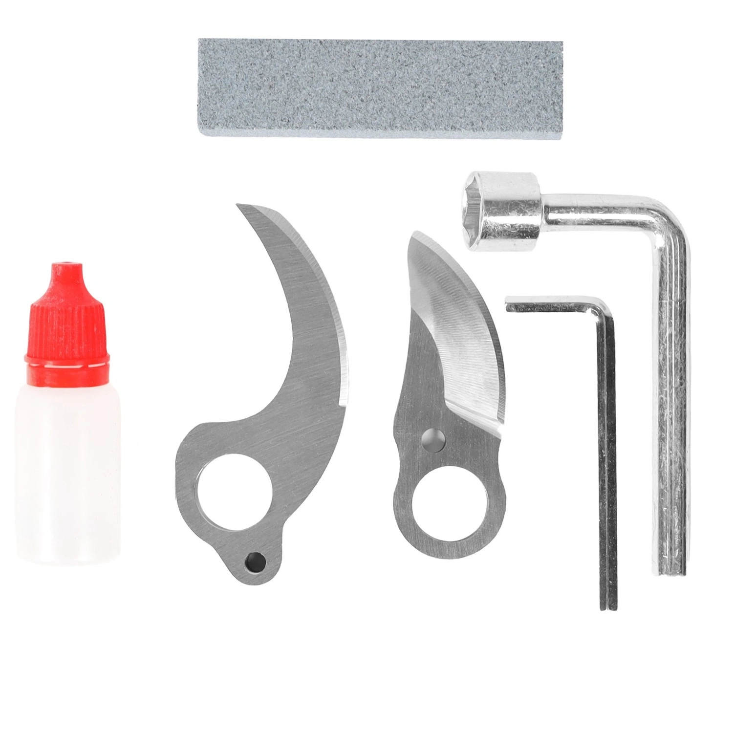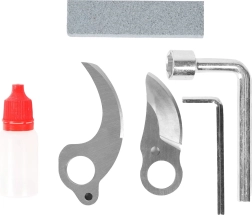 Zamek bezpieczeństwa chroni przed przypadkowym otwarciem. Zestaw zawiera zapasowe ostrza, klucze, kamień do ostrzenia i olej dla długiej żywotności.