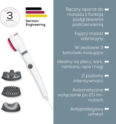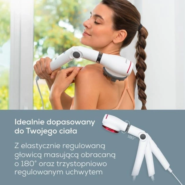 Dzięki dużej powierzchni masującej i grzewczej oraz głowicy obrotowej w zakresie 180° łatwo dotrzesz także do trudniej dostępnych miejsc. Trzy wysokiej jakości nasadki masujące pozwalają dopasować masaż do Twoich potrzeb – od powierzchniowego po punktowy.
