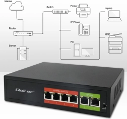 Kompaktowy i niezawodny przełącznik PoE do sieci domowej i firmowej z 4 portami 10/100 Mb/s PoE oraz 2 portami uplink RJ45. Wspiera IEEE 802.3af z mocą do 15,4 W na port i łącznie 65 W. Oferuje instalację plug & play, automatyczne wykrywanie urządzeń PoE, cichą pracę bez wentylatora oraz wytrzymałą metalową obudowę dla stabilnej pracy.