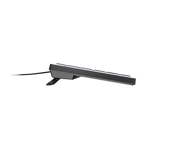Składane nóżki do regulacji kąta oraz antypoślizgowe podkładki zapewniają pewność na biurku. Pełna sekcja numeryczna i 12 klawiszy funkcyjnych przyspieszają codzienną pracę.