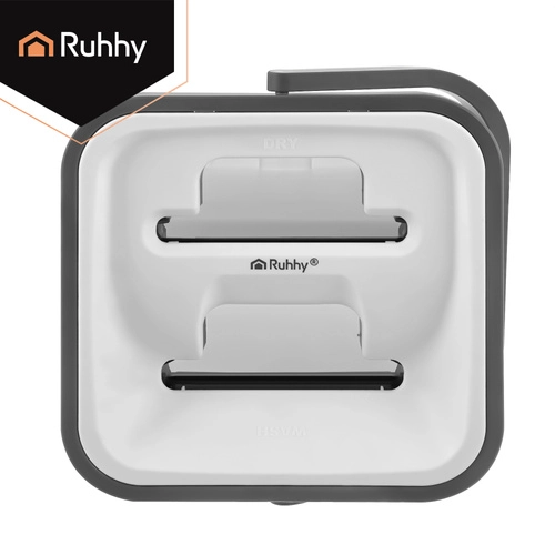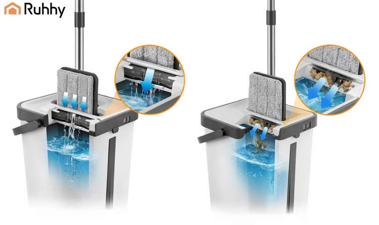Zestaw RUHHY łączy duże dwukomorowe wiadro do osobnego płukania i wyciskania, dzięki czemu nie przenosisz zanieczyszczeń z powrotem na podłogę. Bezdotykowy system reguluje wilgotność mopa bez kapania i jest delikatny dla wrażliwych podłóg.