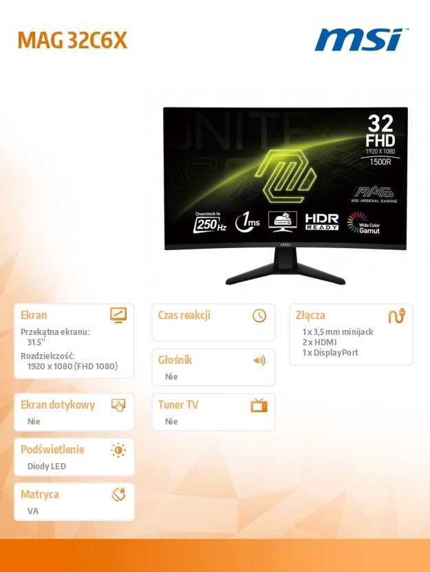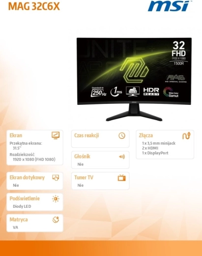 MAG 32C6X łączy dużą przekątną 31,5" z zakrzywionym ekranem dla bardziej naturalnego pola widzenia i wyższego komfortu podczas grania i pracy. Wysoka częstotliwość odświeżania 250 Hz minimalizuje rozmycie ruchu i zapewnia wyjątkowo płynne wrażenia wizualne w strzelankach, wyścigach oraz tytułach e‑sportowych.
