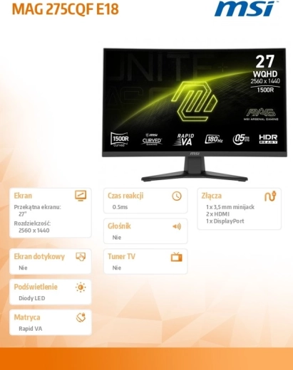 Monitor MAG 275CQF E18 zapewnia zrównoważony stosunek szczegółowości i szybkości. Rozdzielczość WQHD na przekątnej 27" gwarantuje szczegółowy obraz, a częstotliwość odświeżania 180 Hz dostarcza wyjątkowo płynnych ruchów. Zakrzywienie ekranu wciąga w akcję i podnosi komfort podczas długiego oglądania.