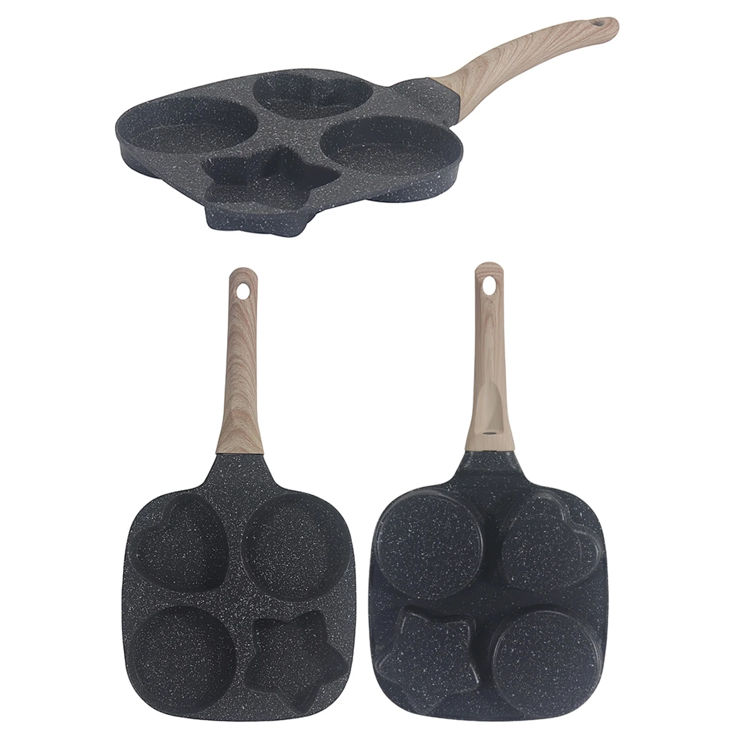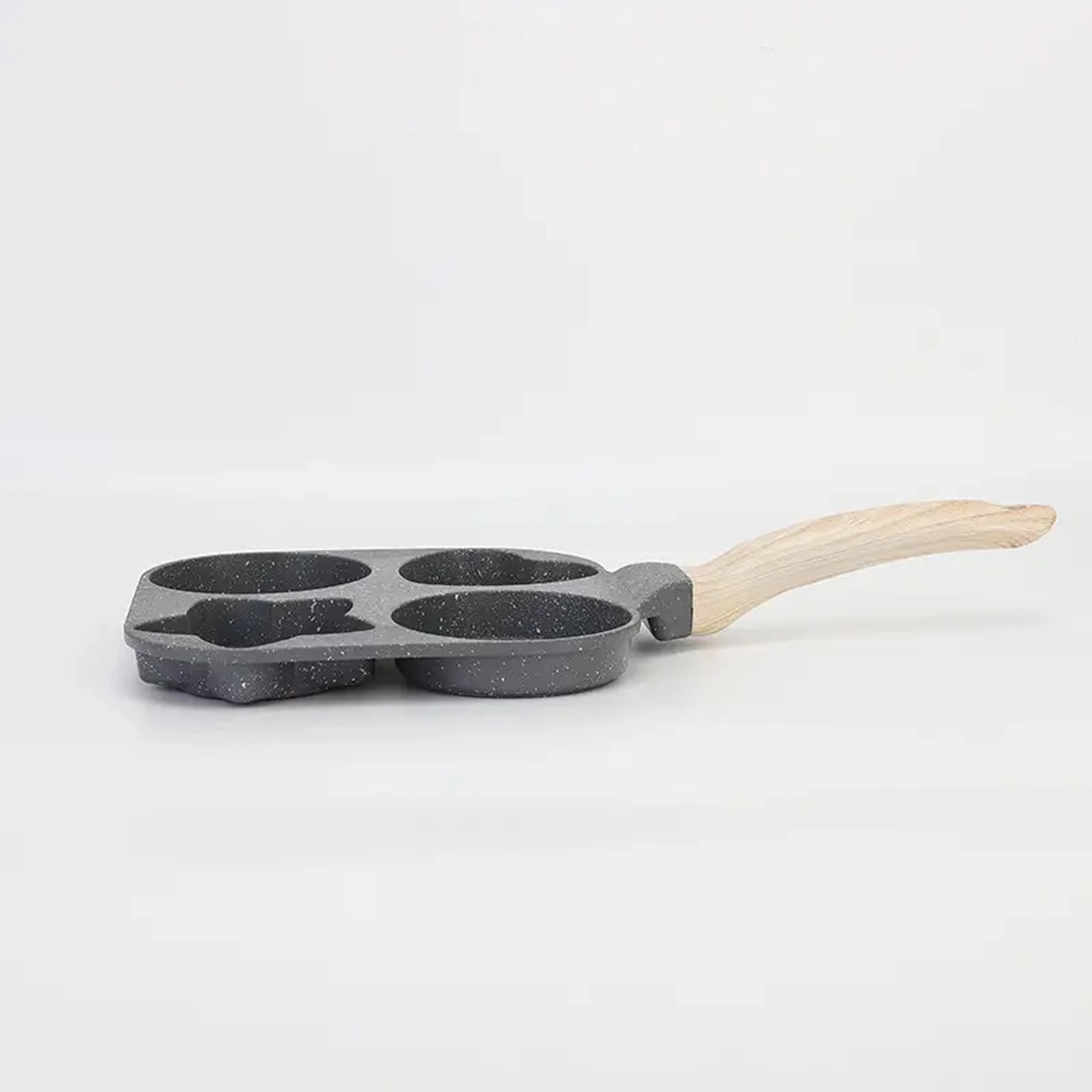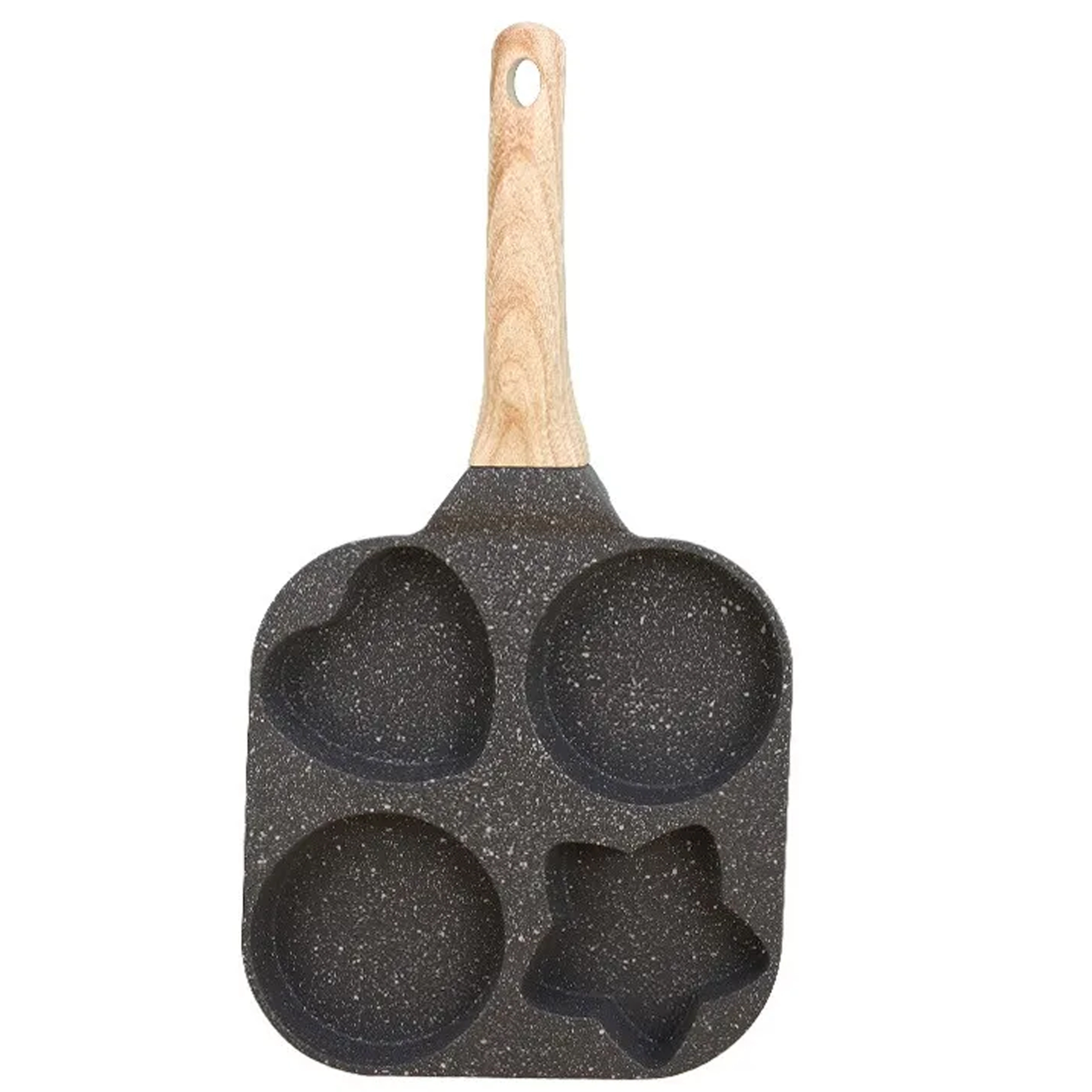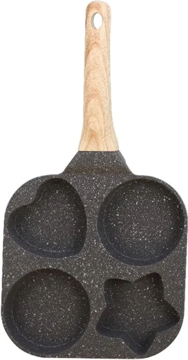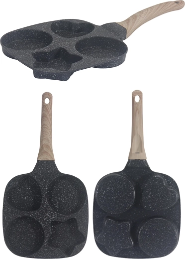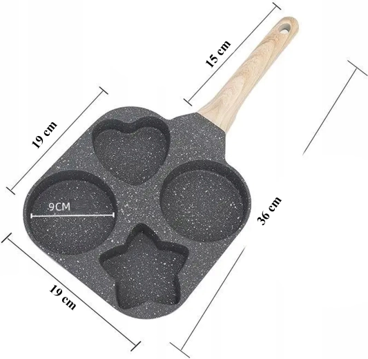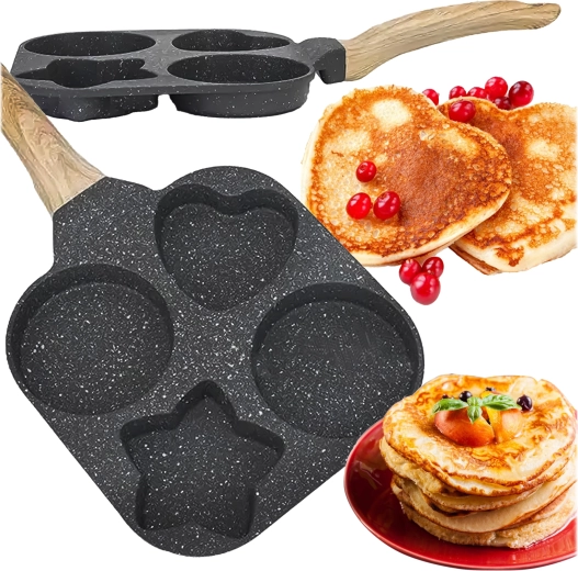 Zamień każde śniadanie w przyjemność dzięki tej multifunkcyjnej patelni z czterema formami – dwiema okrągłymi, sercem i gwiazdą. Dzięki nieprzywierającej powłoce, ergonomicznej rączce o drewnianym wyglądzie oraz kompatybilności z indukcją i gazem przygotujesz jajka, placuszki czy placki szybko, czysto i w idealnych kształtach.