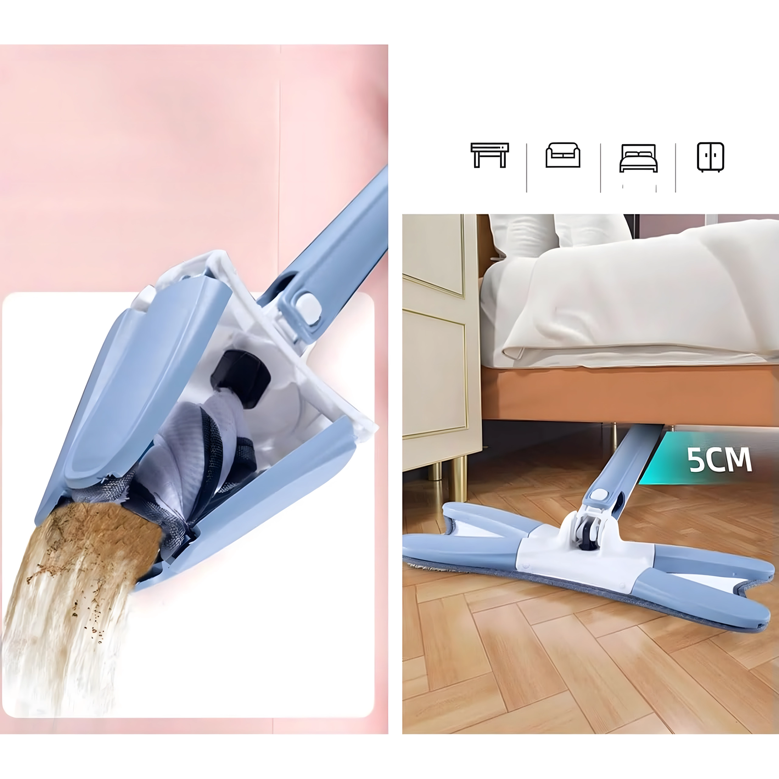 • Szybkie wyciskanie bez wiadra z wyciskarką: czyste ręce i mniej wody na podłodze.