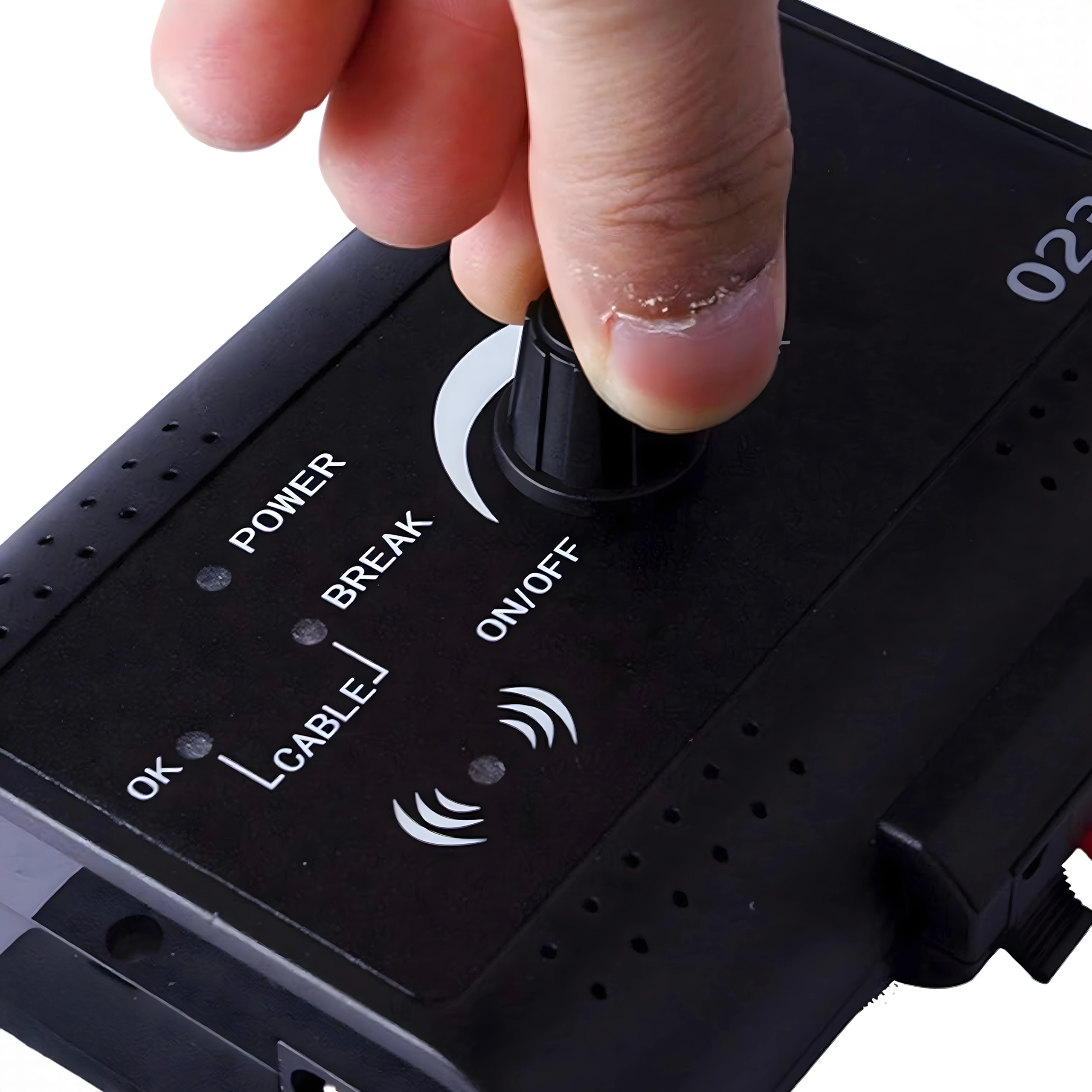 Jednostka centralna oferuje płynną regulację siły korekcji i przejrzyste kontrolki LED (Power, Break, Cable, OK), dzięki czemu zawsze masz podgląd stanu systemu.