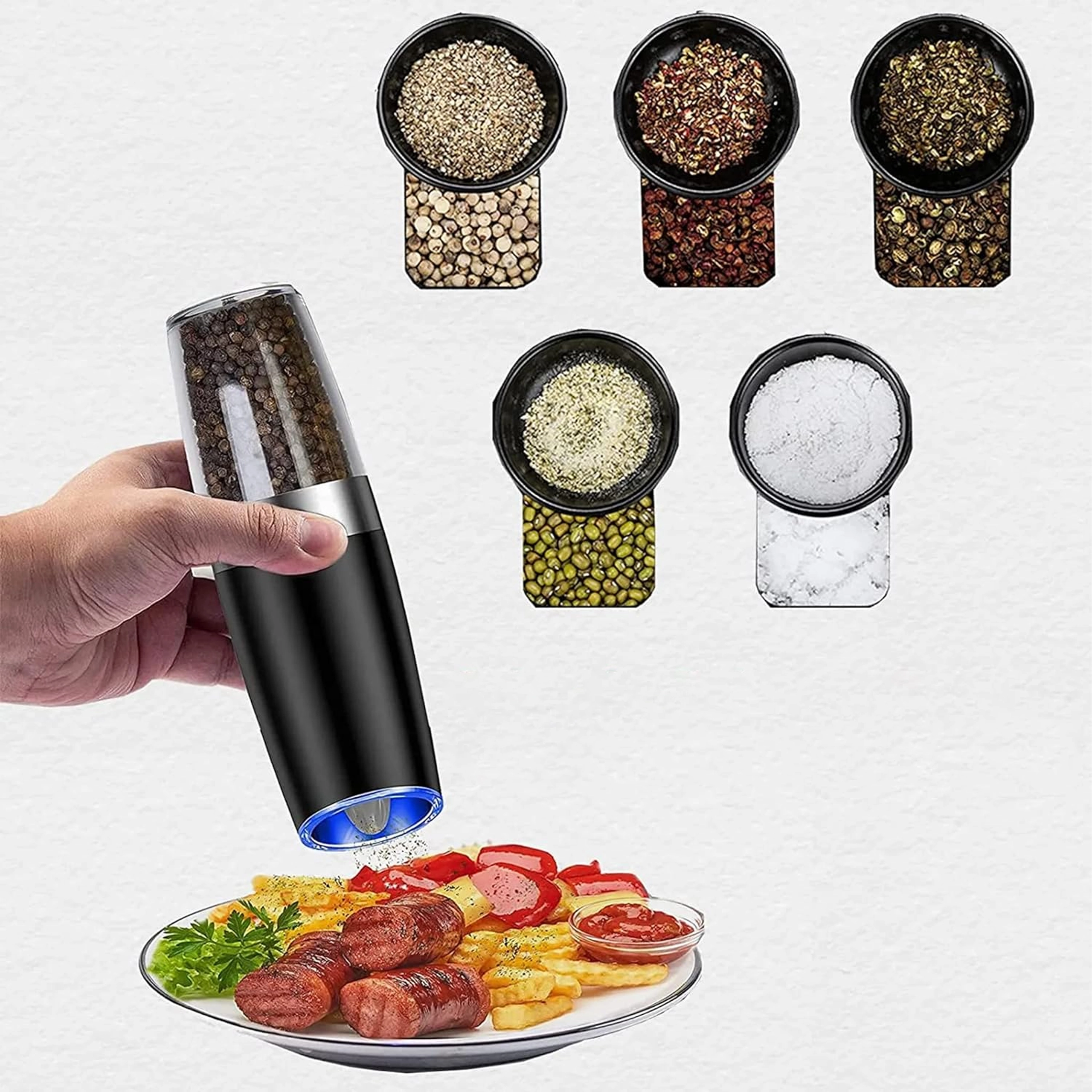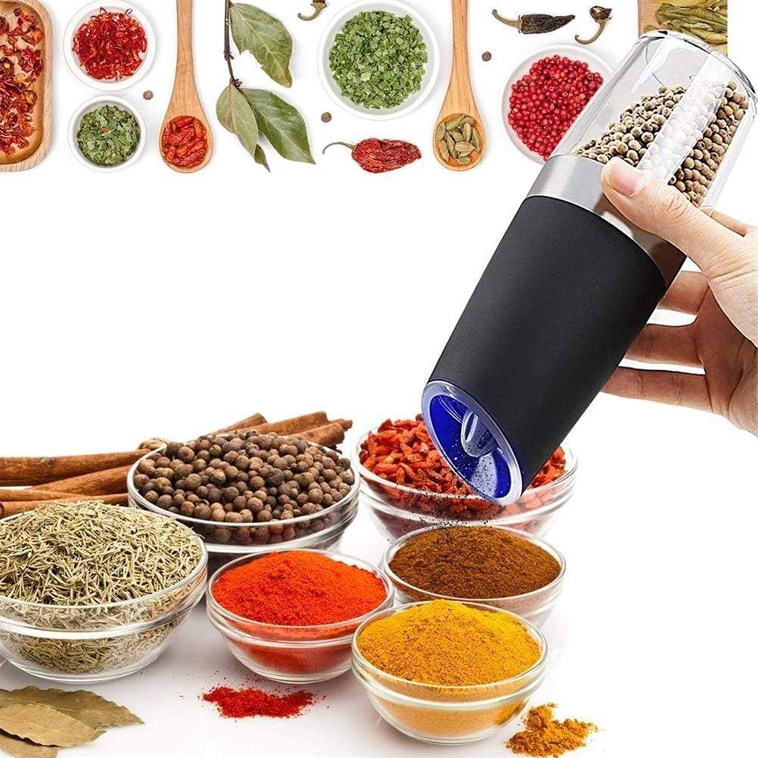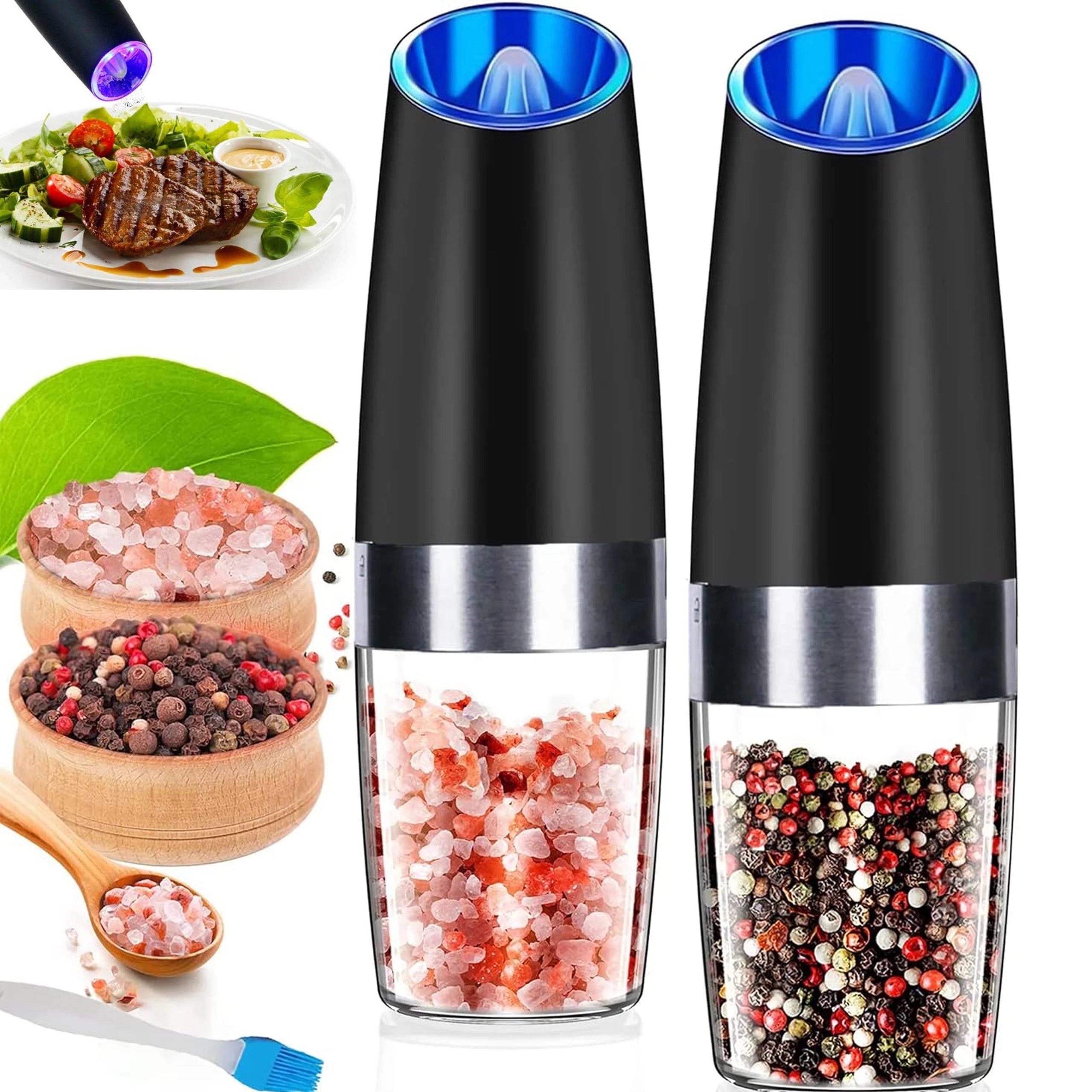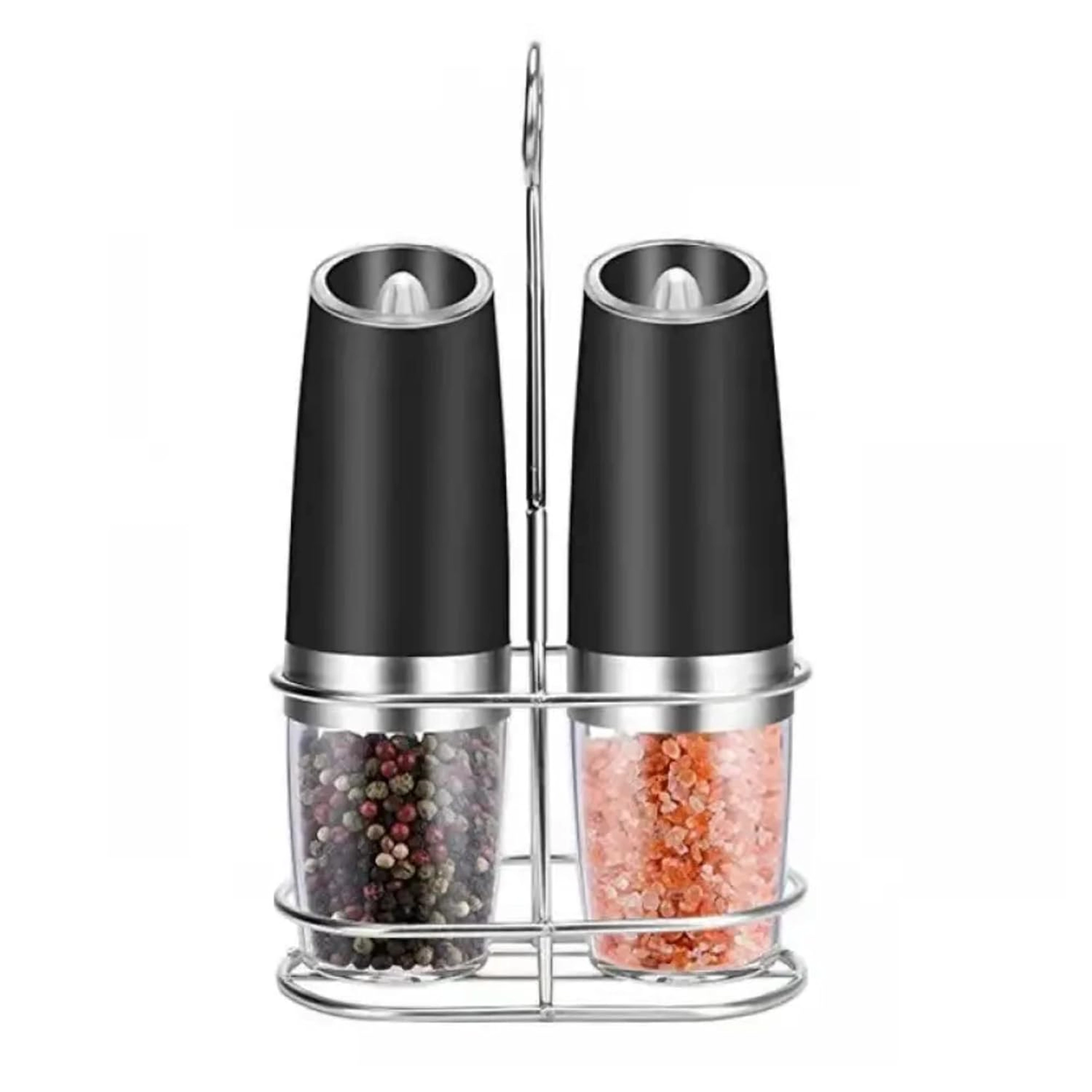 Odkryj wygodę codziennego doprawiania z zestawem dwóch elektrycznych młynków grawitacyjnych. Wystarczy je przechylić, aby świeżo zmielić sól, pieprz lub inne przyprawy – bez naciskania przycisków. Przezroczysty zbiornik dla łatwej kontroli, regulowana grubość mielenia oraz zintegrowane oświetlenie LED dla precyzyjnego dozowania czynią z tych młynków stylowy i praktyczny dodatek do każdej kuchni. Automatyczne mielenie, obsługa jedną ręką, światło LED i nowoczesny design na blat kuchenny.
