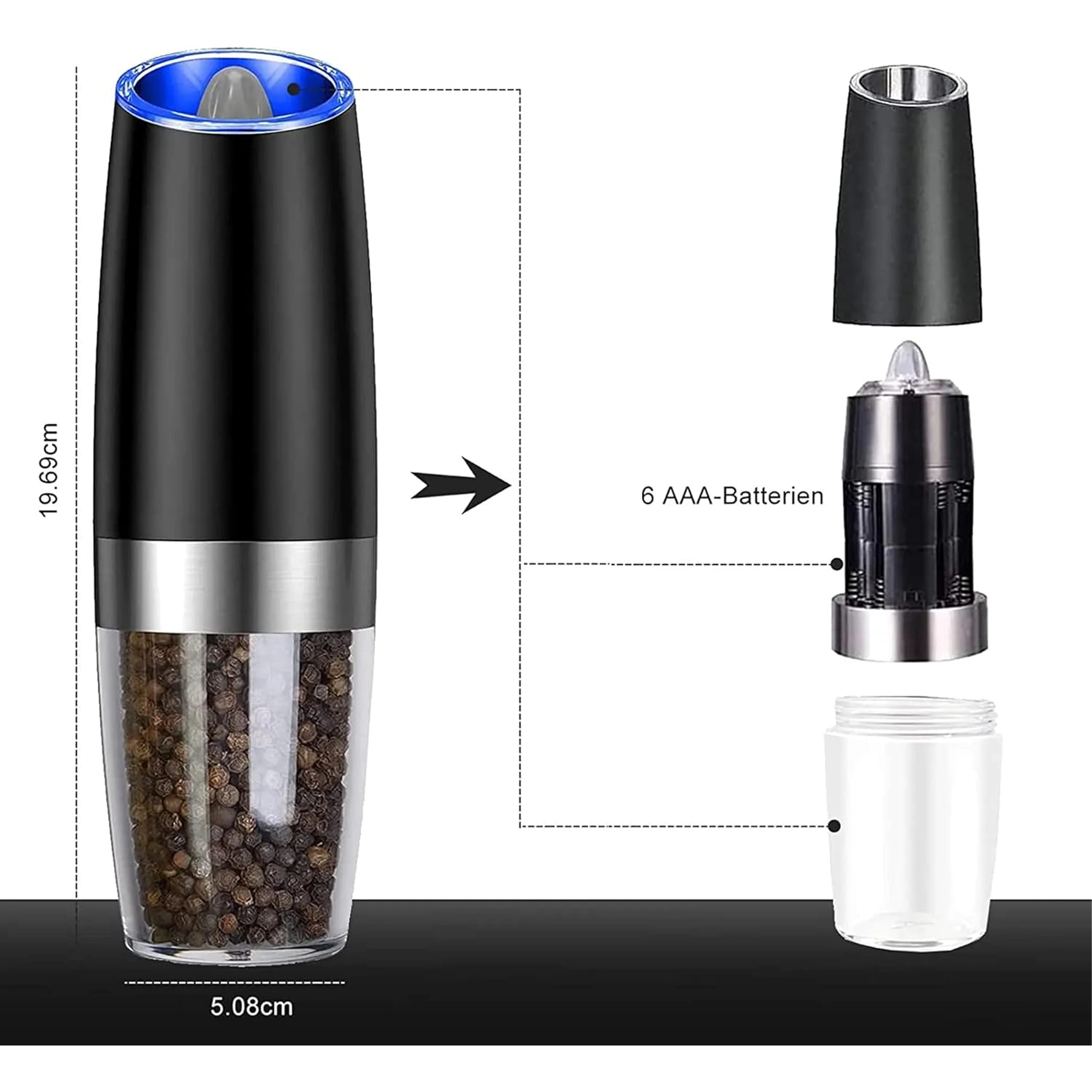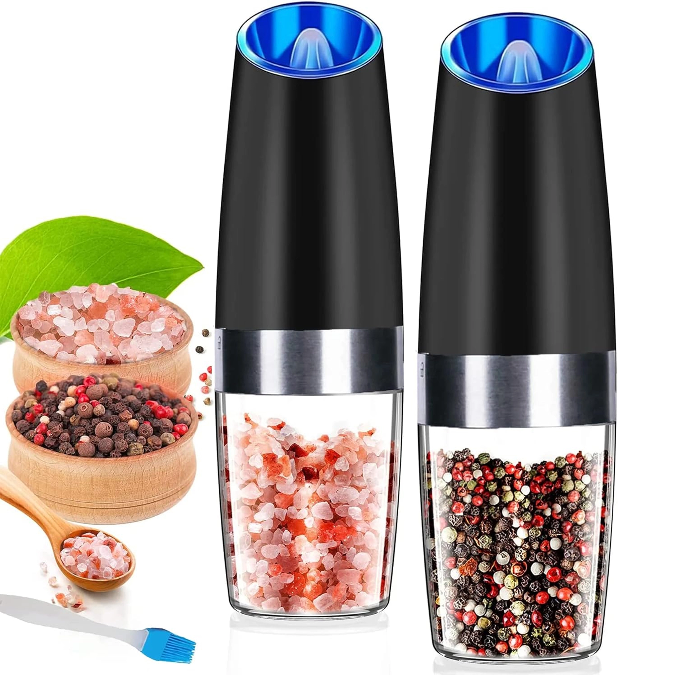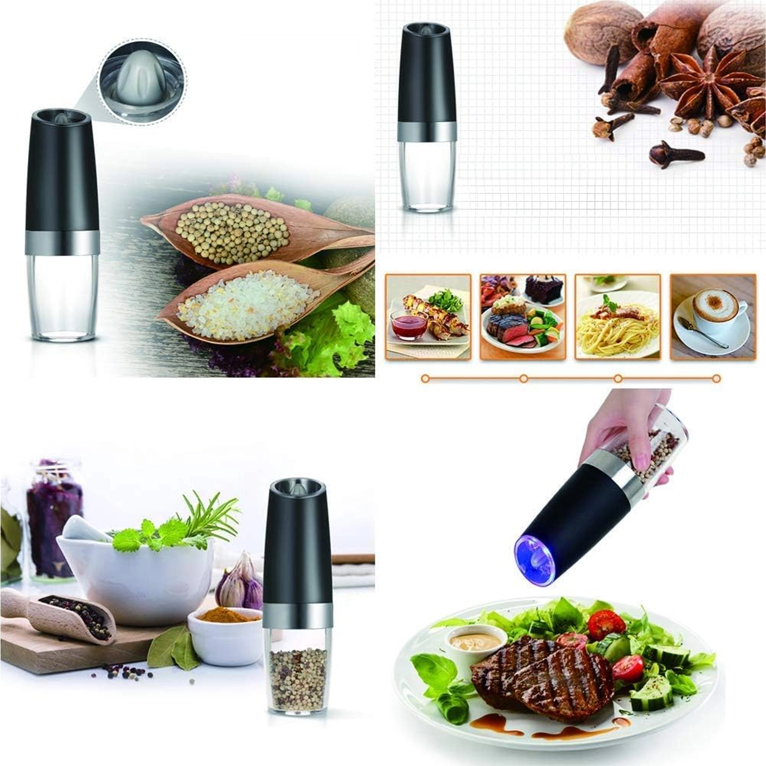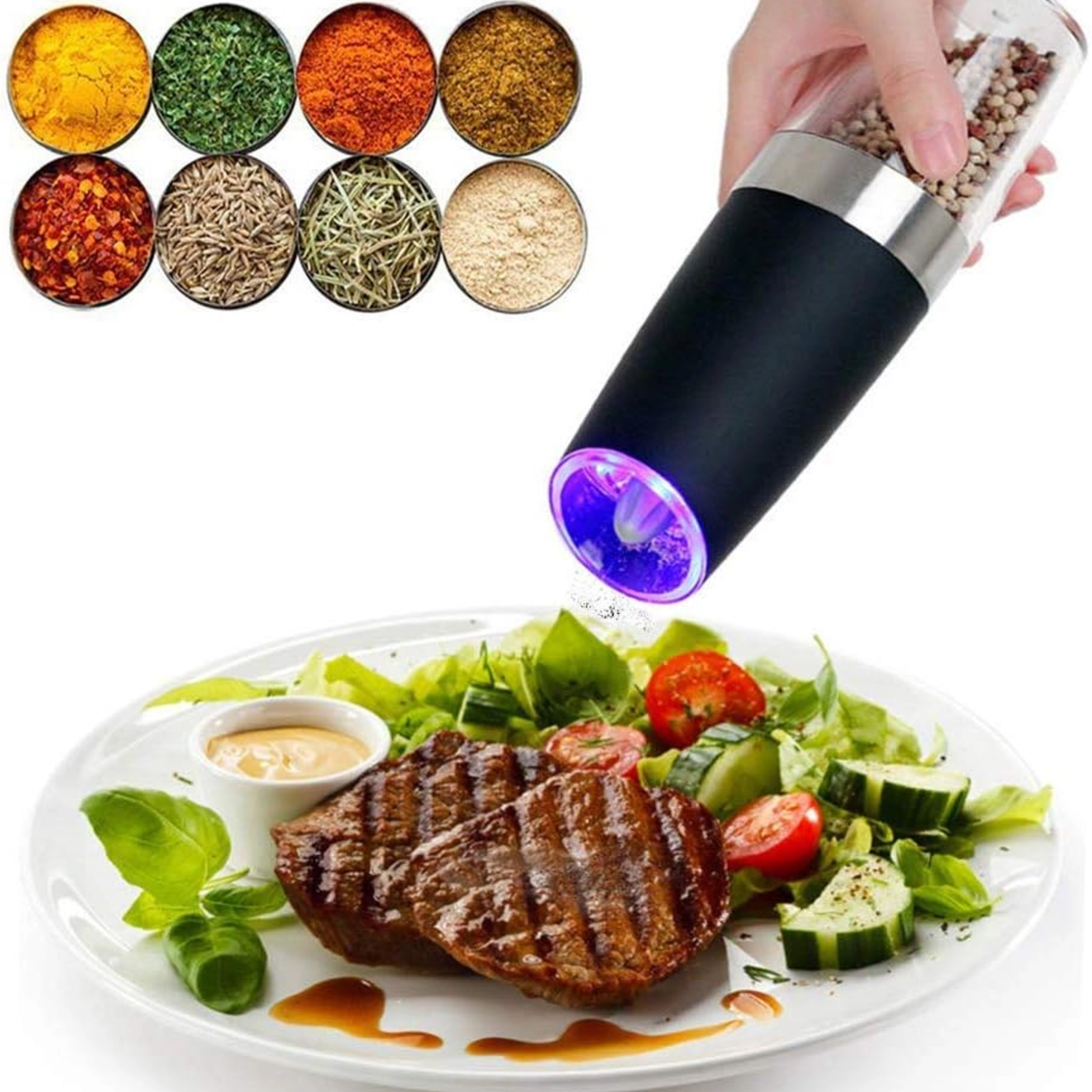 Odkryj wygodę codziennego doprawiania z zestawem dwóch elektrycznych młynków grawitacyjnych. Wystarczy je przechylić, aby świeżo zmielić sól, pieprz lub inne przyprawy – bez naciskania przycisków. Przezroczysty zbiornik dla łatwej kontroli, regulowana grubość mielenia oraz zintegrowane oświetlenie LED dla precyzyjnego dozowania czynią z tych młynków stylowy i praktyczny dodatek do każdej kuchni. Automatyczne mielenie, obsługa jedną ręką, światło LED i nowoczesny design na blat kuchenny.