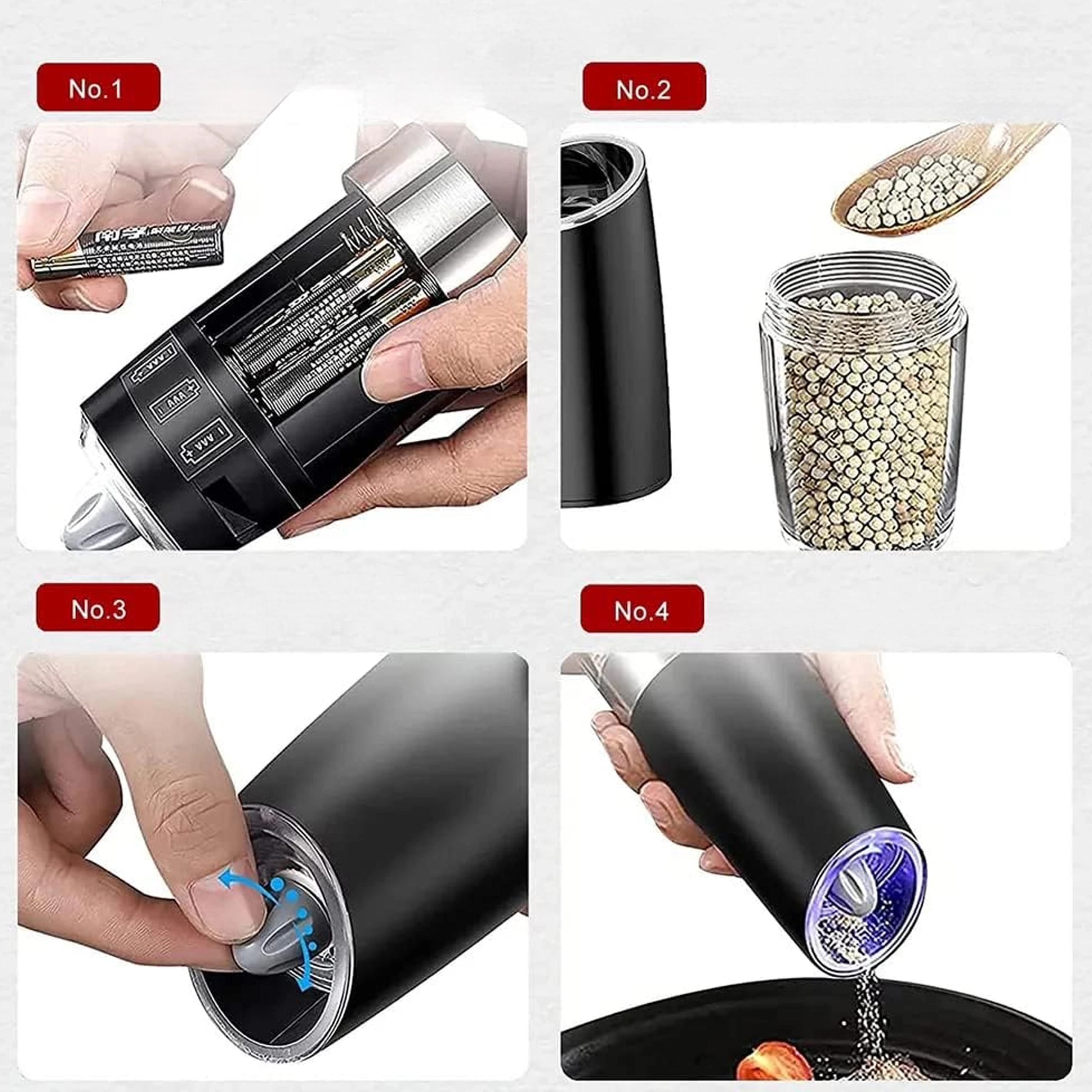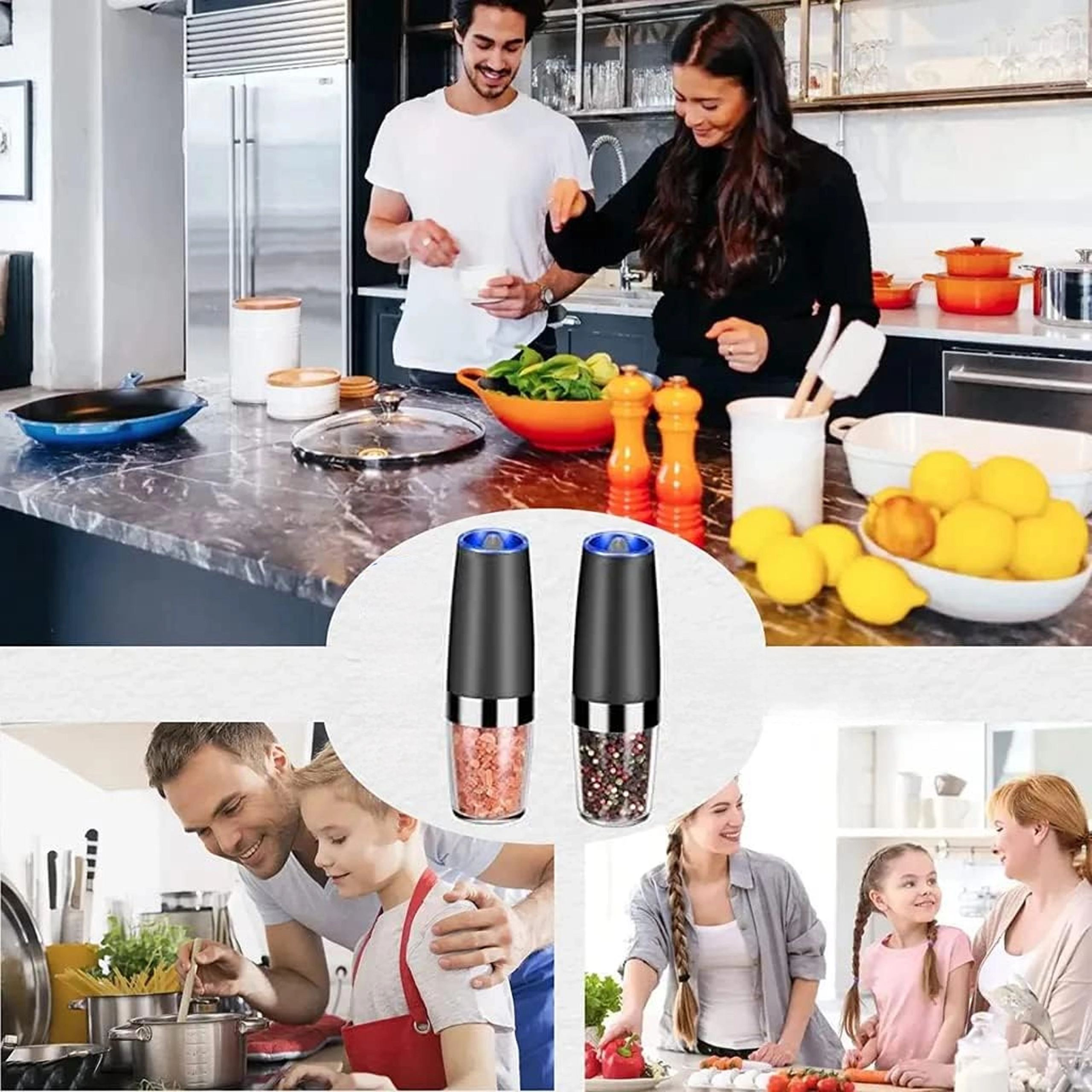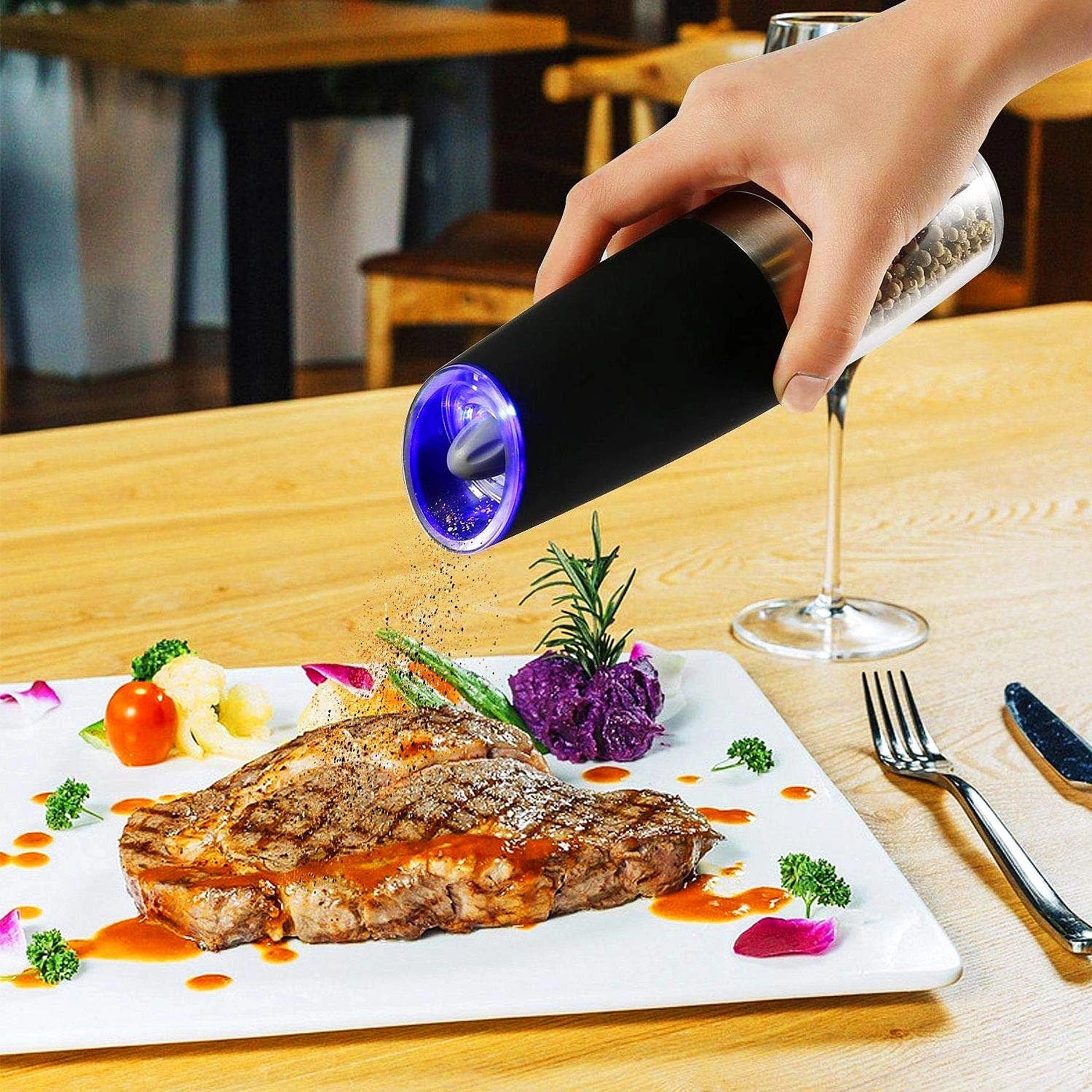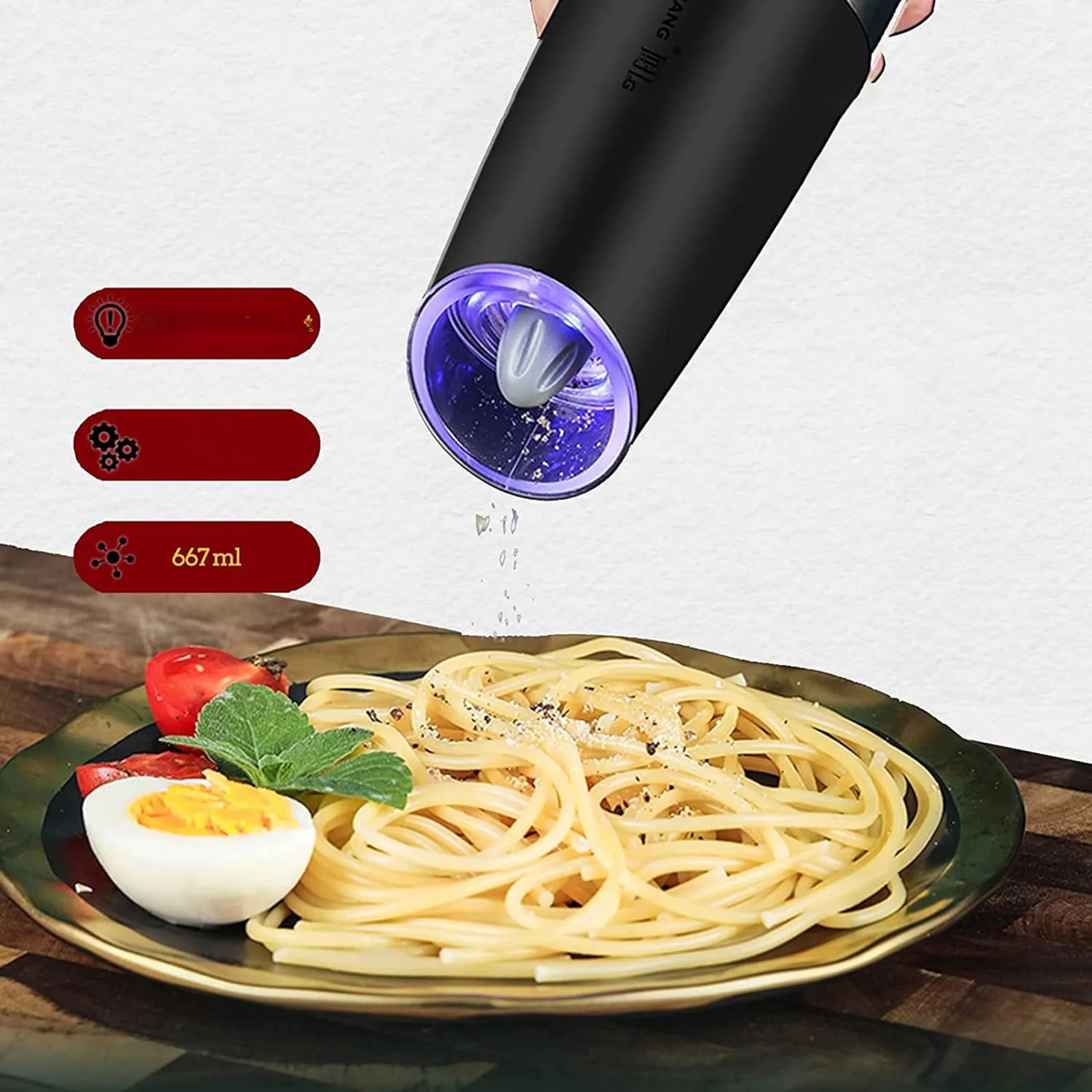 Odkryj wygodę codziennego doprawiania z zestawem dwóch elektrycznych młynków grawitacyjnych. Wystarczy je przechylić, aby świeżo zmielić sól, pieprz lub inne przyprawy – bez naciskania przycisków. Przezroczysty zbiornik dla łatwej kontroli, regulowana grubość mielenia oraz zintegrowane oświetlenie LED dla precyzyjnego dozowania czynią z tych młynków stylowy i praktyczny dodatek do każdej kuchni. Automatyczne mielenie, obsługa jedną ręką, światło LED i nowoczesny design na blat kuchenny.