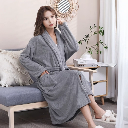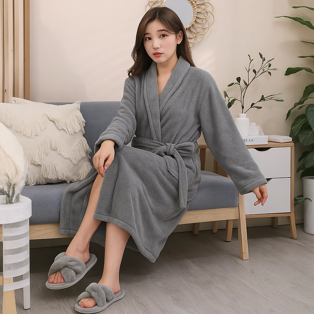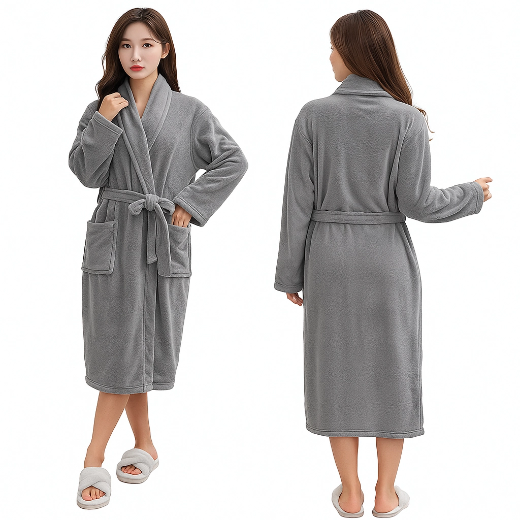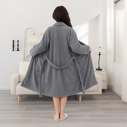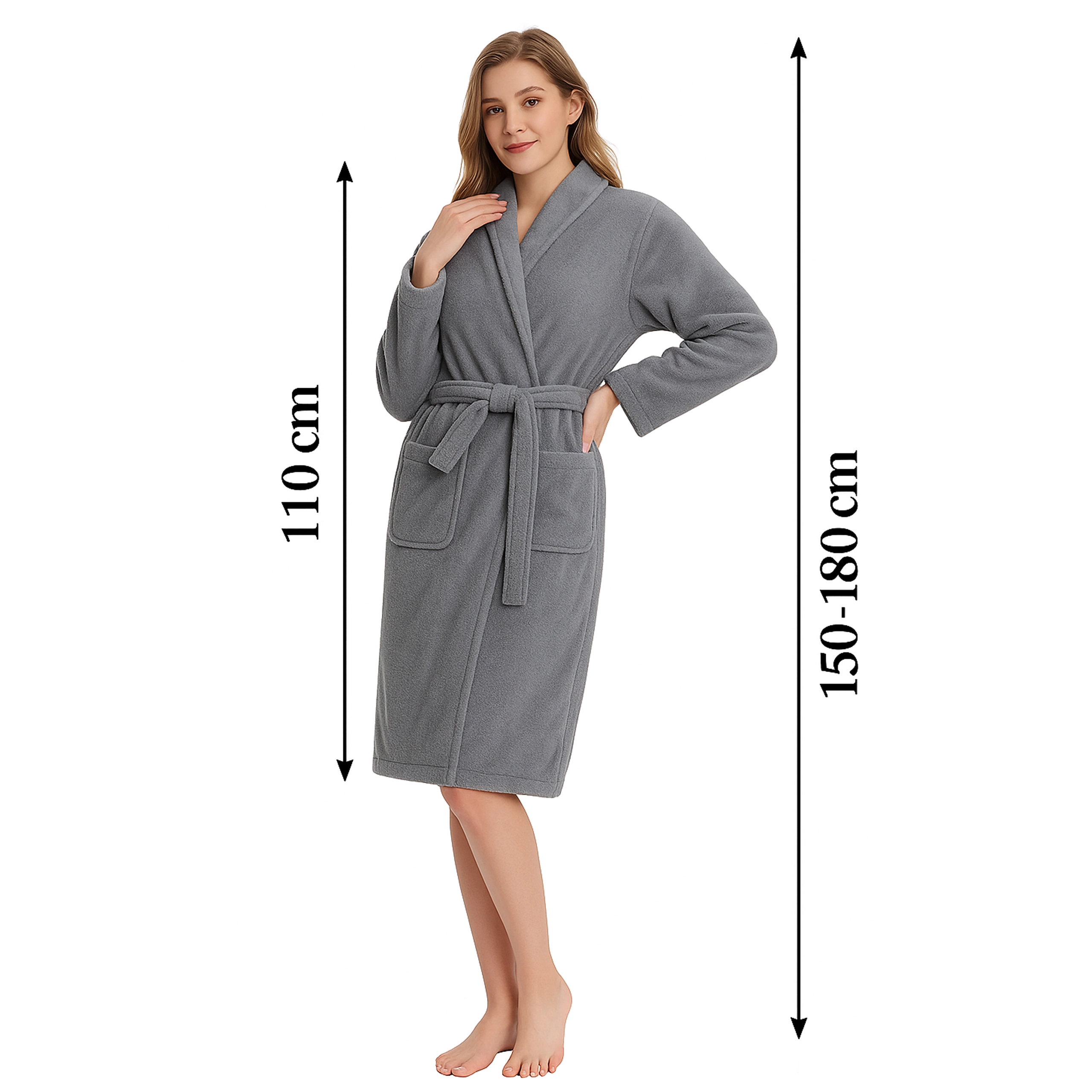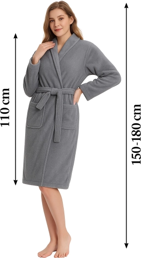 Ten damski szlafrok w eleganckim szarym kolorze jest idealny na chwile odpoczynku w domu i po prysznicu. Miękkie, pluszowe mikrowłókno przyjemnie ogrzewa, a kołnierz szalowy i pasek w pasie podkreślają wygodny krój oraz łatwe dopasowanie do sylwetki.