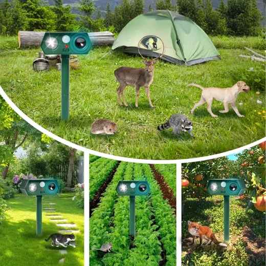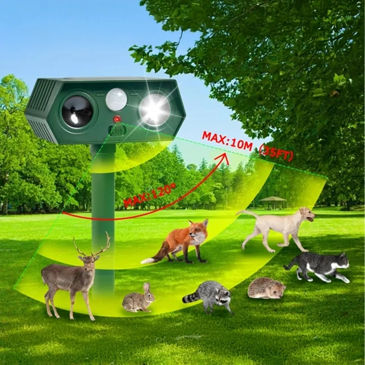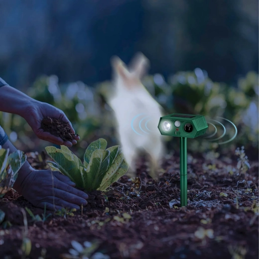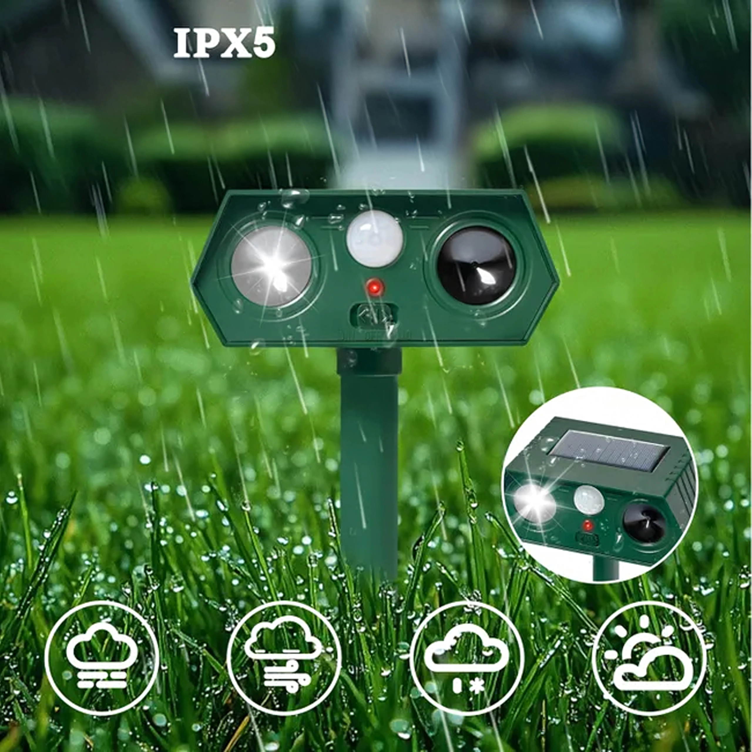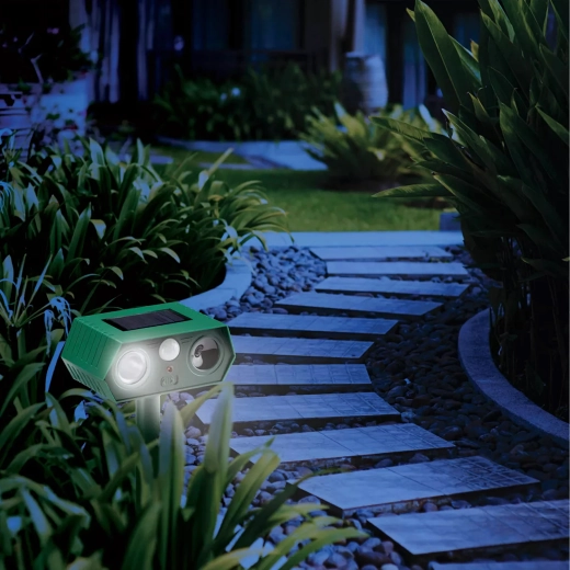 Głośnik ultradźwiękowy i jasne światło LED pomagają odstraszyć koty, psy, lisy, kuny, zające, wiewiórki, ptaki oraz drobne gryzonie.
