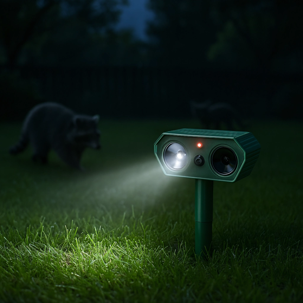 - Automatyczna aktywacja – czujnik PIR uruchamia ultradźwięki i błyski tylko przy ruchu.