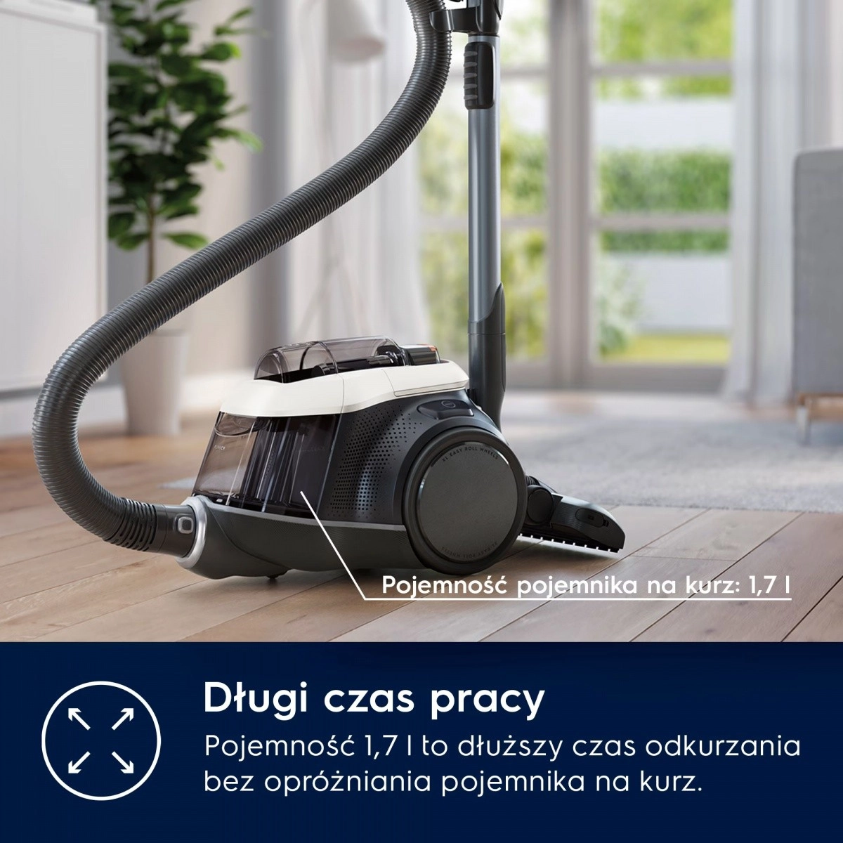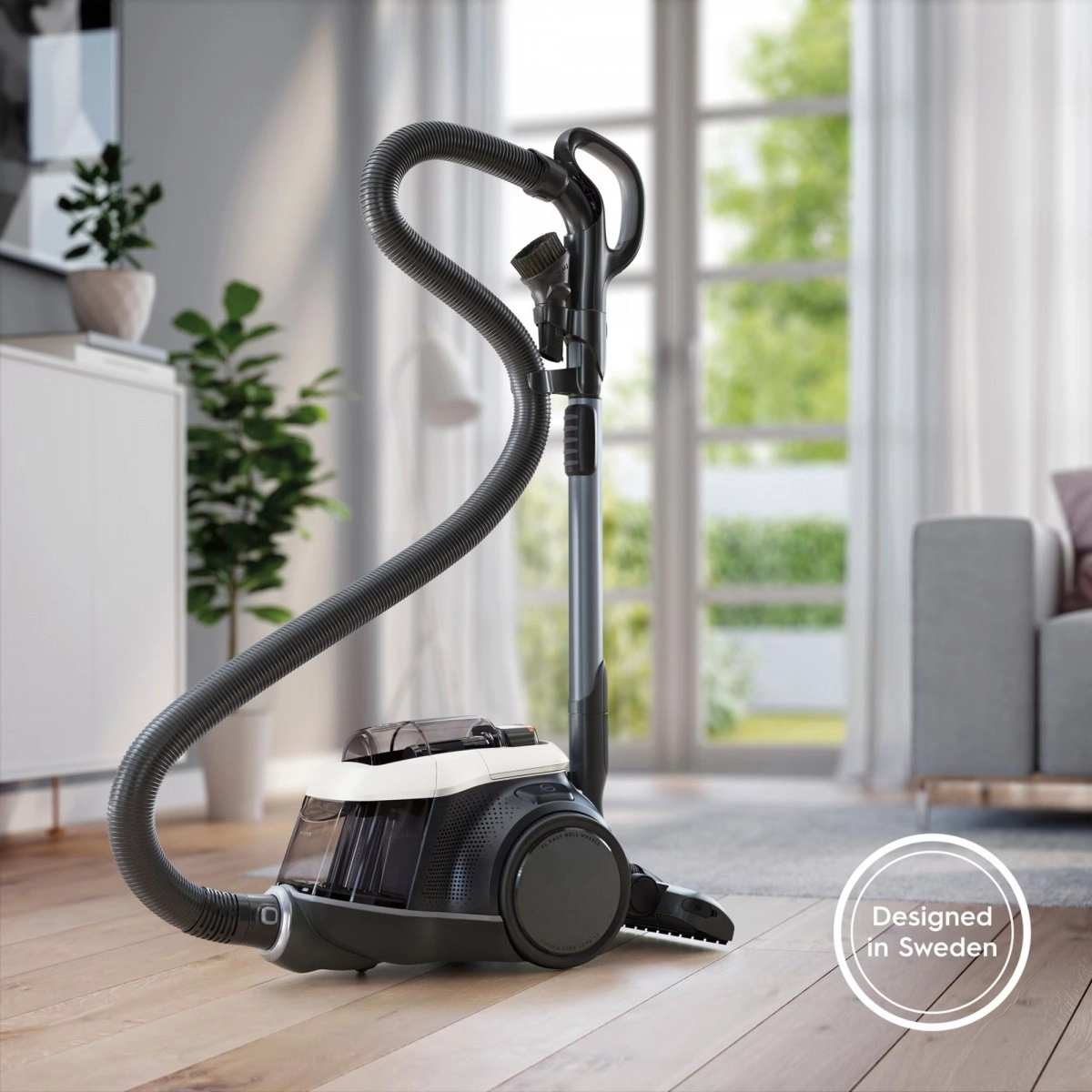 Filtracja HEPA wychwytuje aż 99,999% drobnych cząstek (drobny pył, roztocza i alergeny) o wielkości 0,3 µm, co przyczynia się do czystszego powietrza w domu. Intuicyjna konstrukcja umożliwia szybkie opróżnianie pojemnika i łatwy dostęp do filtrów. Duże, lekko obracające się koła zapewniają płynną manewrowość wokół mebli i przeszkód.