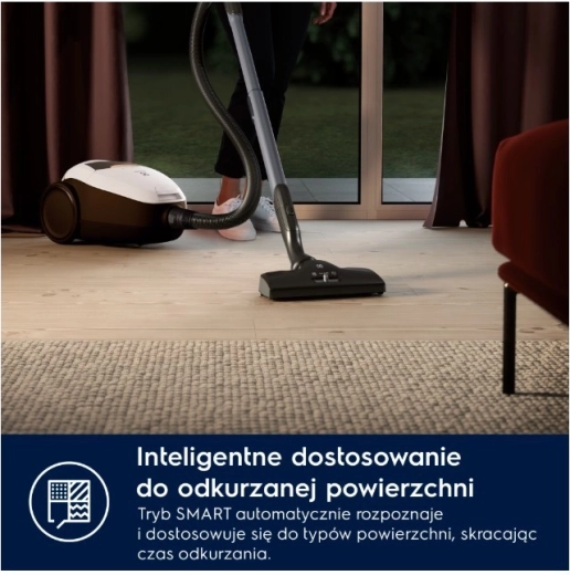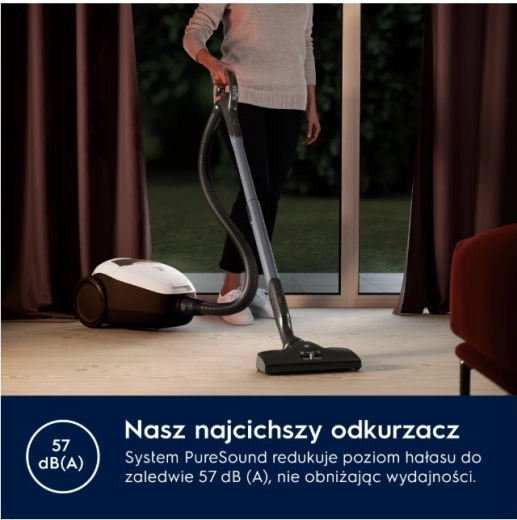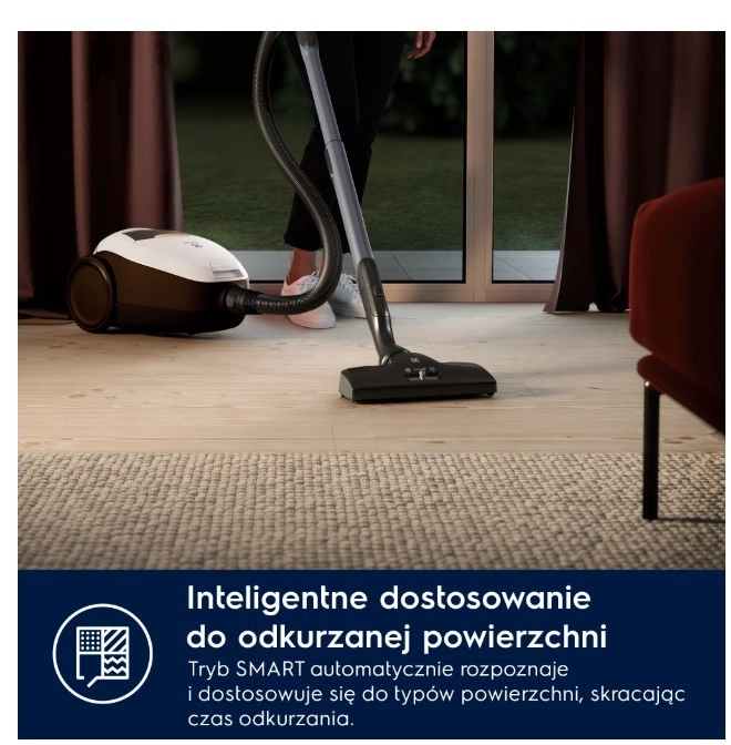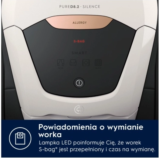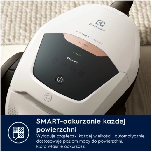 PURE D8.2 SILENCE to jeden z najcichszych tradycyjnych odkurzaczy workowych – dzięki innowacyjnemu systemowi PureSound osiąga hałas jedynie 57 dB(A). Dzięki automatycznej regulacji SmartMode sam rozpoznaje rodzaj powierzchni i dopasowuje moc, więc możesz płynnie przechodzić z twardej podłogi na dywan bez ręcznych ustawień.