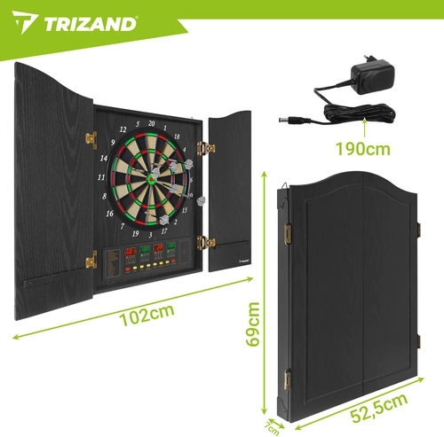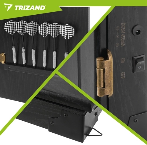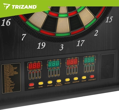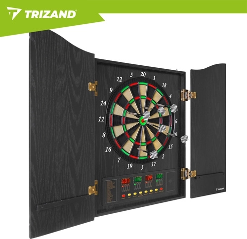Elektroniczna tarcza do darta TRIZAND to nowoczesna domowa rozrywka dla rodziny i przyjaciół. Dzięki automatycznemu systemowi punktacji, regulacji głośności i czytelnym wyświetlaczom LED masz wyniki zawsze pod kontrolą. Elegancka szafka z drzwiczkami chroni tarczę przed kurzem i świetnie pasuje do salonu, pokoju gier czy biura.