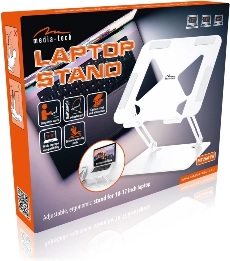 Uniwersalny stojak na laptop w eleganckim białym kolorze poprawia ergonomię i cyrkulację powietrza. Dzięki solidnej metalowej konstrukcji, płynnej regulacji wysokości i kąta do ok. 17 cm oraz antypoślizgowym podkładkom silikonowym zyskasz stabilne oparcie dla laptopów 10–17" oraz tabletów. Składana konstrukcja ułatwia przenoszenie i przechowywanie.