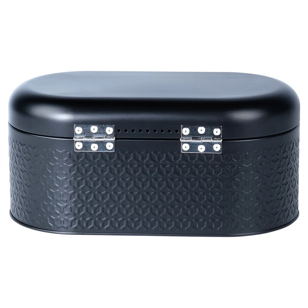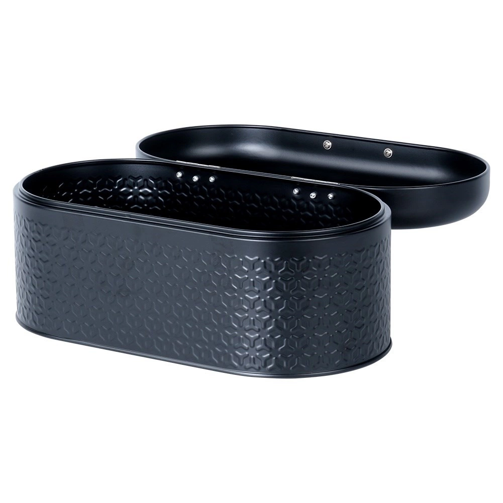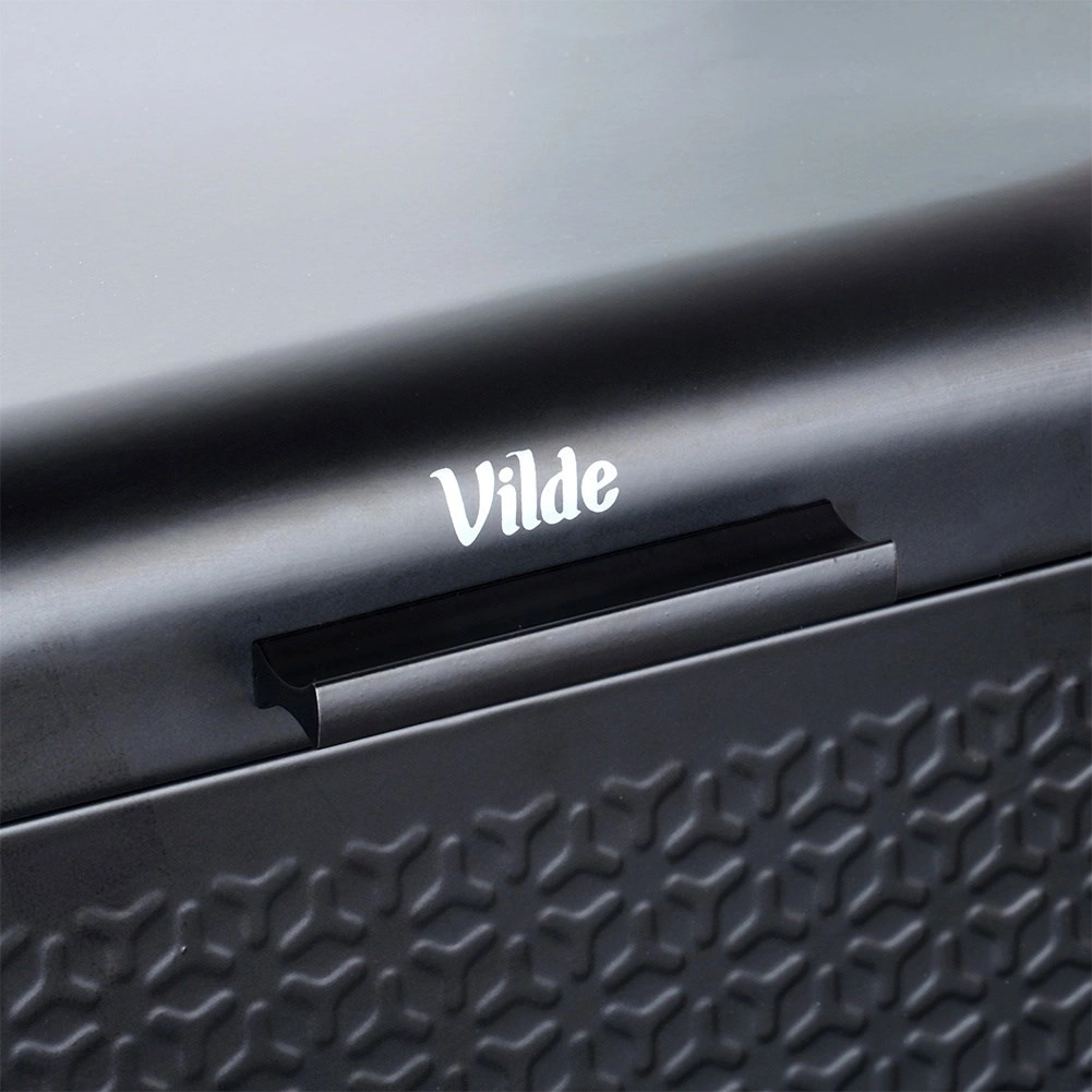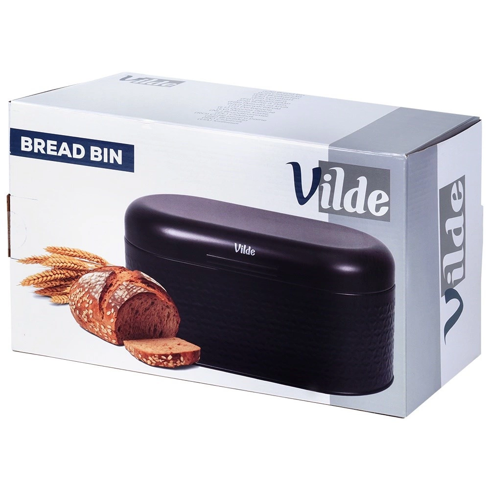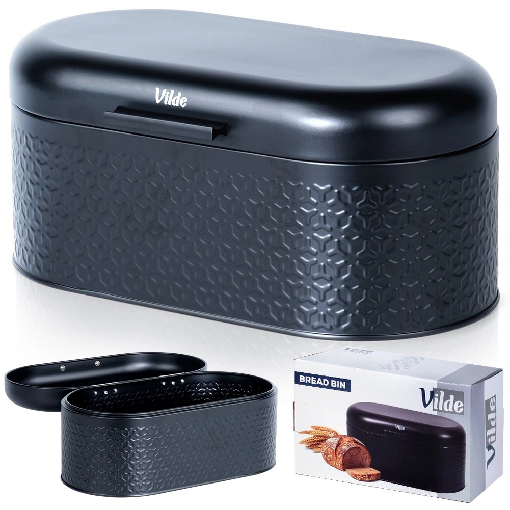 Stylowy stalowy chlebak Vilde utrzymuje Twoje pieczywo dłużej świeże. Dzięki solidnej konstrukcji i szczelnej pokrywie skutecznie zapobiega wysychaniu i chroni przed uszkodzeniami. Jest kompaktowy, ale pojemny, o wymiarach 34 × 20 × 15 cm, w eleganckim, matowym, czarnym wykończeniu z dekoracyjną teksturą.