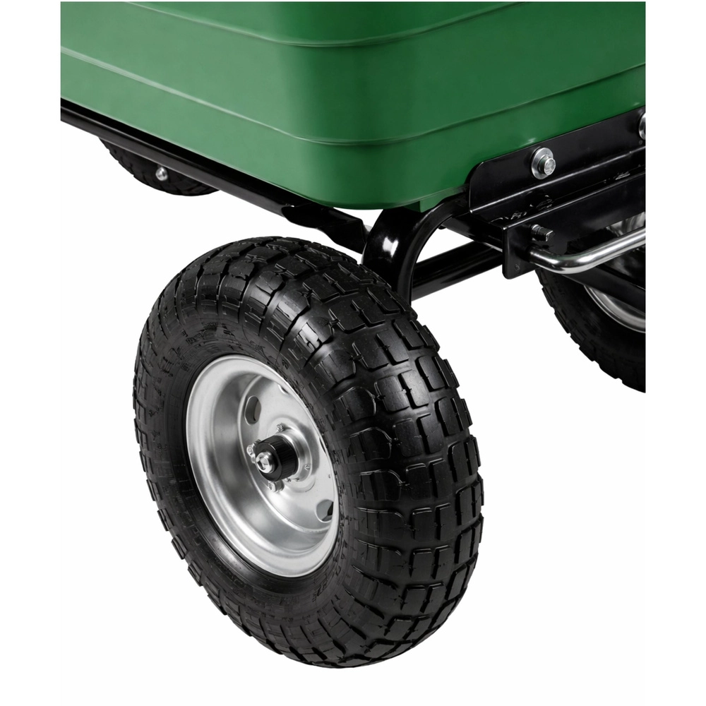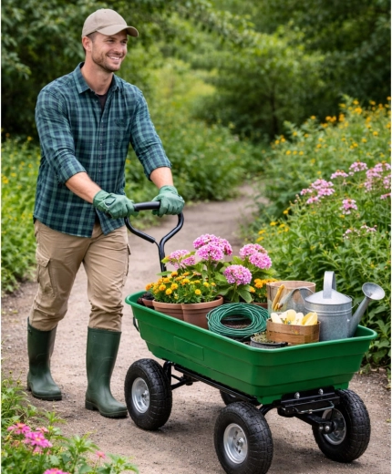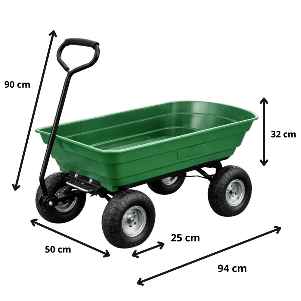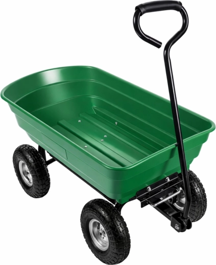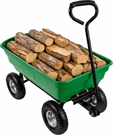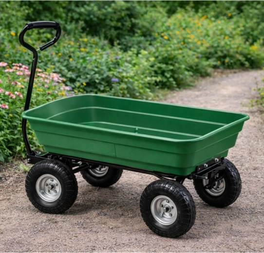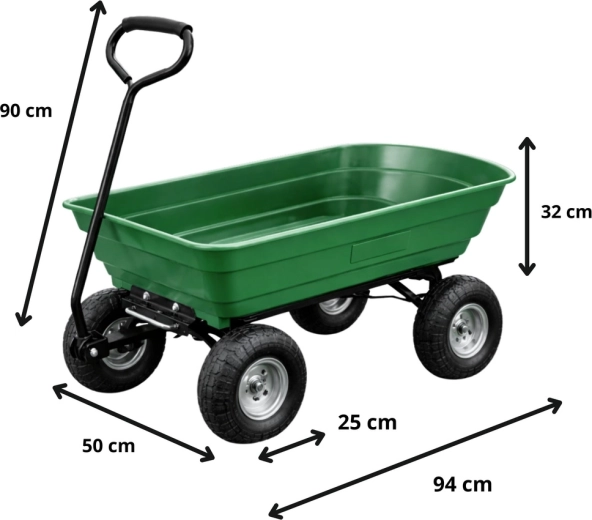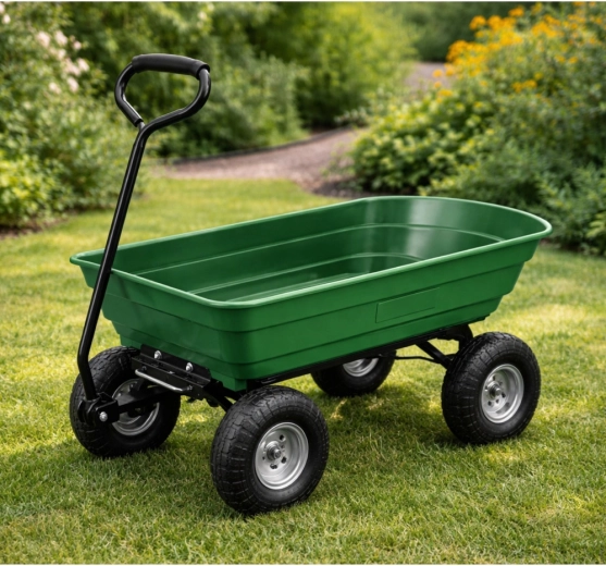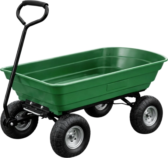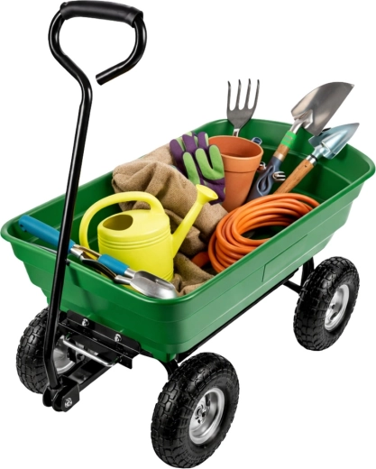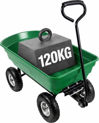 Praktyczny ogrodowy wózek o udźwigu do 120 kg ułatwia przewóz ziemi, narzędzi, nawozów, drewna i odpadów zielonych. Cztery pneumatyczne gumowe koła zapewniają stabilność i płynną jazdę po trawie, żwirze i piasku. Wyjmowana i wywrotna skrzynia przyspiesza załadunek i rozładunek, a ucho holownicze umożliwia podłączenie do traktorka ogrodowego lub kosiarki. Idealny pomocnik do codziennych prac w ogrodzie i wokół domu.