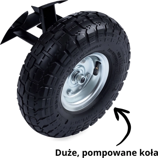 Wytrzymałe gumowe koła na metalowych felgach zapewniają stabilność i płynny przejazd po trawie, żwirze i nierównych ścieżkach.