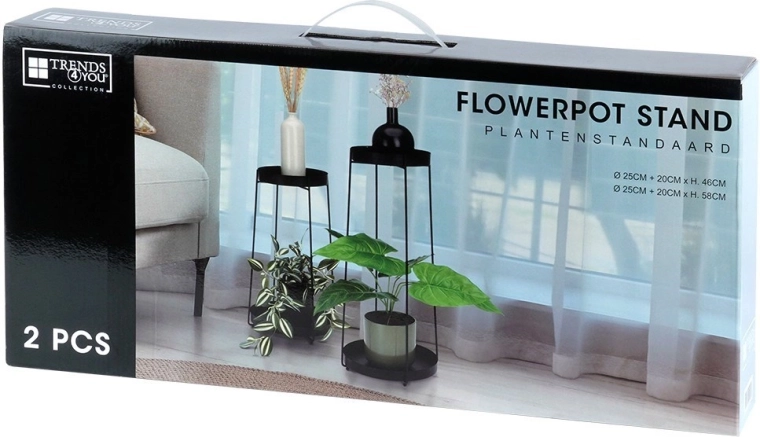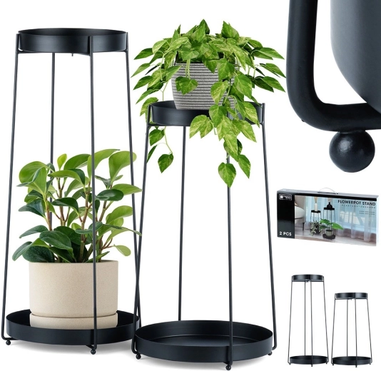Zestaw obejmuje dwa stojaki o wysokości 46 i 58 cm z wyjmowanymi tacami dla łatwego czyszczenia i przenoszenia roślin. Dzięki stabilnej metalowej konstrukcji bezpiecznie utrzyma większość standardowych donic i sprawdzi się również do dekoracji czy drobnych dodatków.