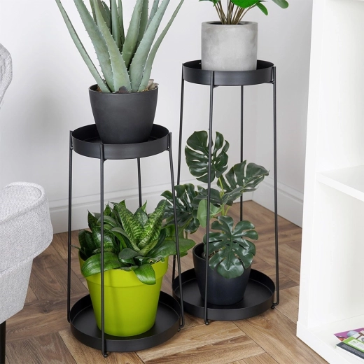 Odkryj nowoczesny sposób na podkreślenie wyglądu roślin doniczkowych. Dwupoziomowe stojaki w ponadczasowej czerni zapewnią estetyczną ekspozycję, lepszą cyrkulację powietrza oraz łatwiejsze utrzymanie porządku wokół. Połączenie smukłych linii i solidnych metalowych mis z rantem doskonale pasuje do wnętrz w stylu loft, modern i scandi.