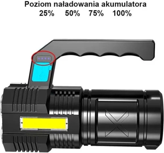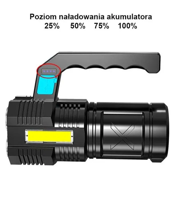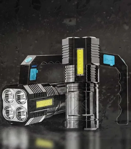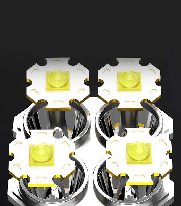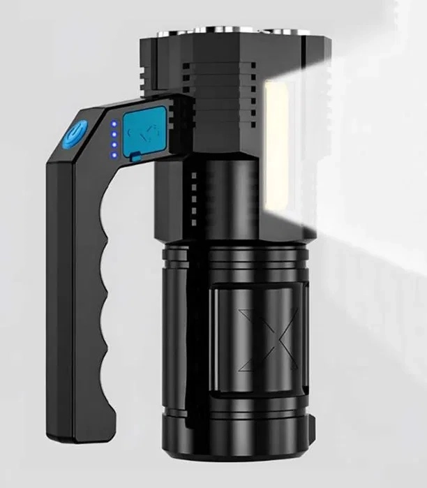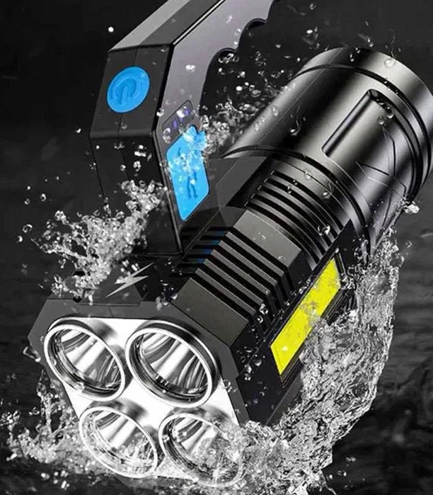 Ta wytrzymała, wodoodporna latarka LED łączy mocny główny strumień światła z czterema diodami T6 oraz praktyczne boczne światło robocze COB do rozproszonego oświetlenia bez oślepiania. Wygodne ładowanie przez USB, a wysokiej jakości akumulator 18650 gwarantuje niezawodną pracę w domu, w samochodzie i podczas aktywności outdoorowych.
