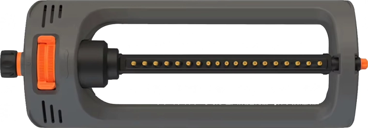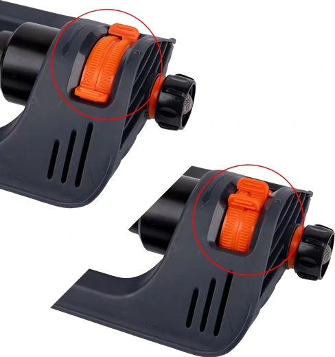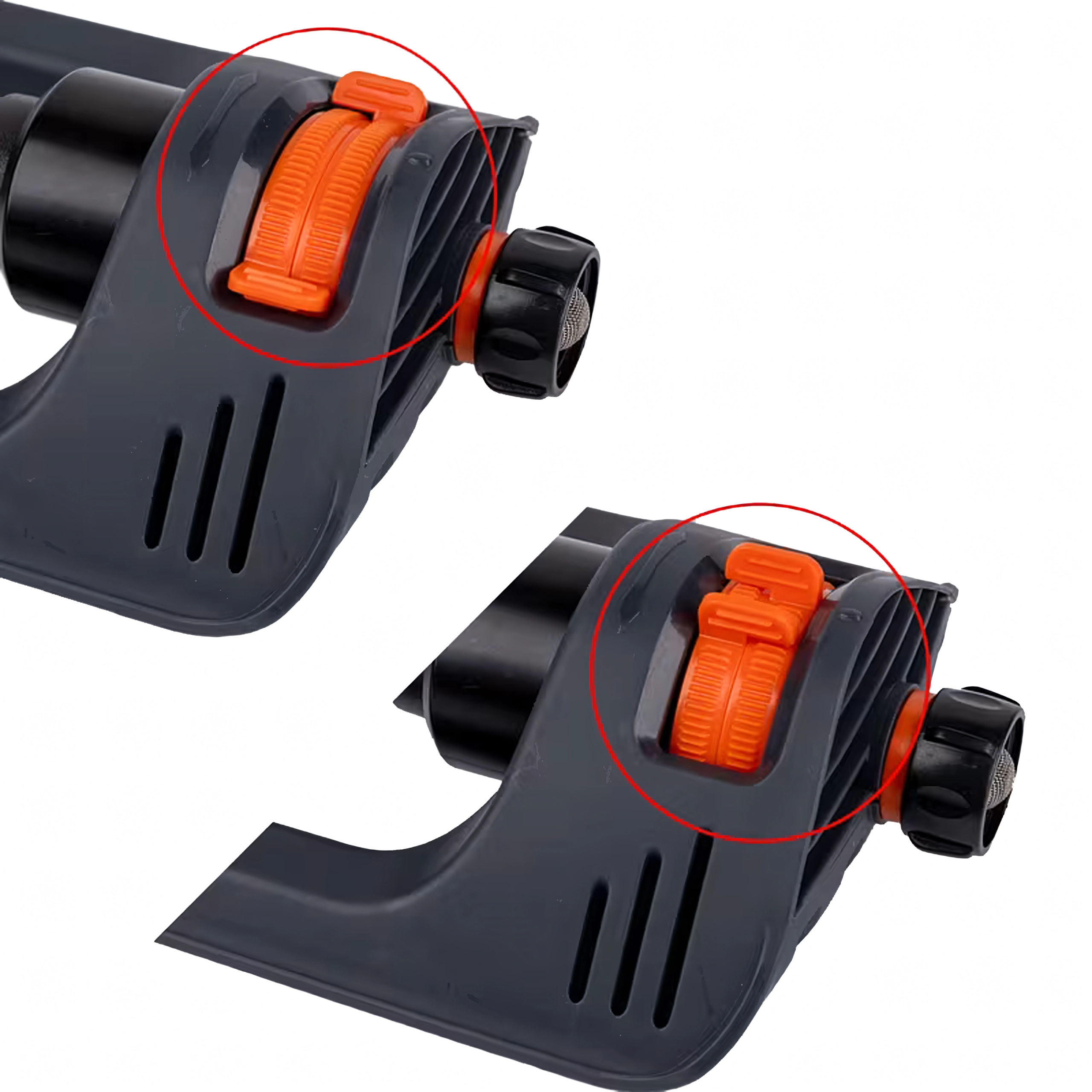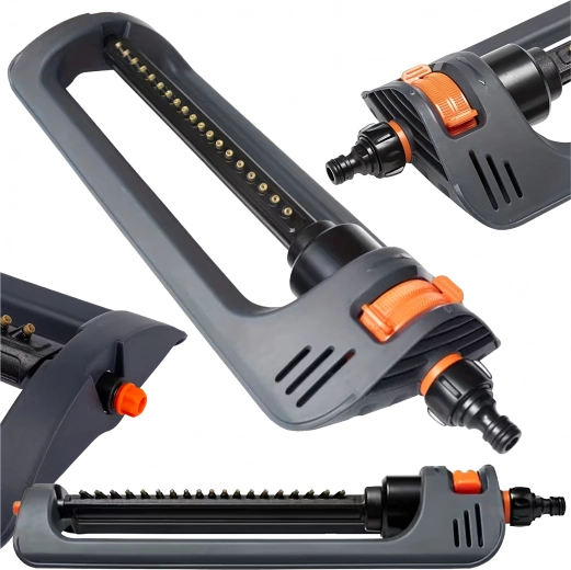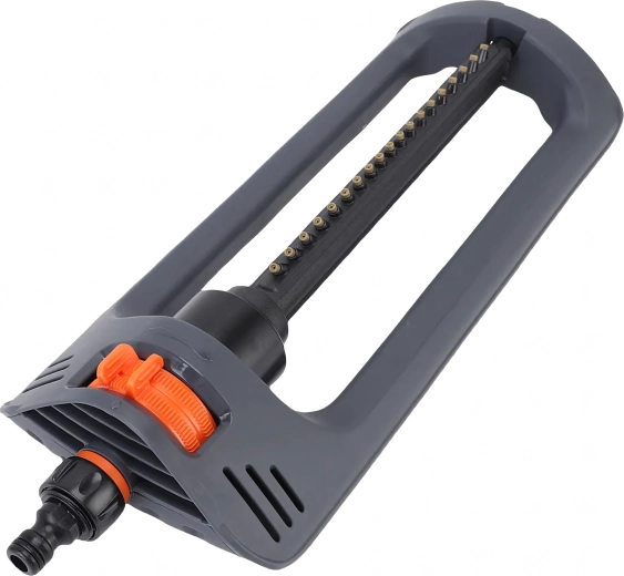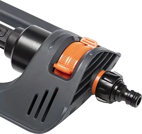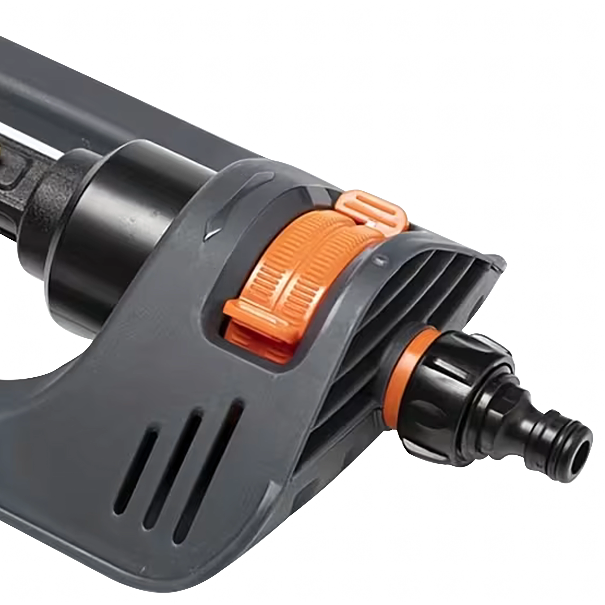 Wytrzymała konstrukcja ze stabilną niskoprofilową ramą utrzymuje zraszacz pewnie na miejscu, a szybkozłączka ułatwia podłączenie do standardowego węża ogrodowego. Elementy sterujące w wyrazistym kolorze zapewniają szybkie i intuicyjne ustawienie przepływu oraz szerokości zraszania.