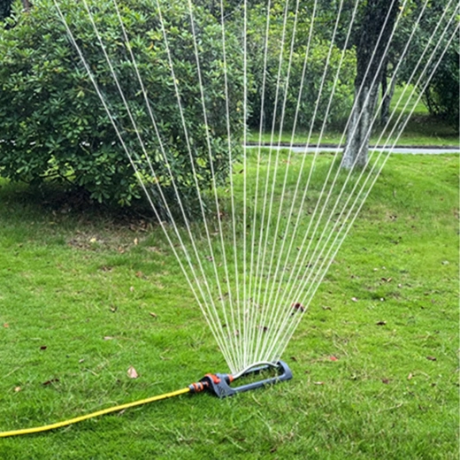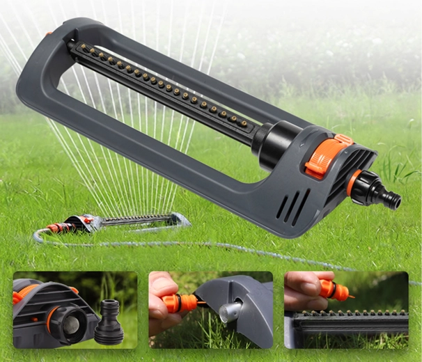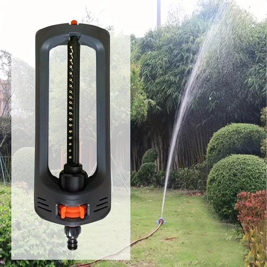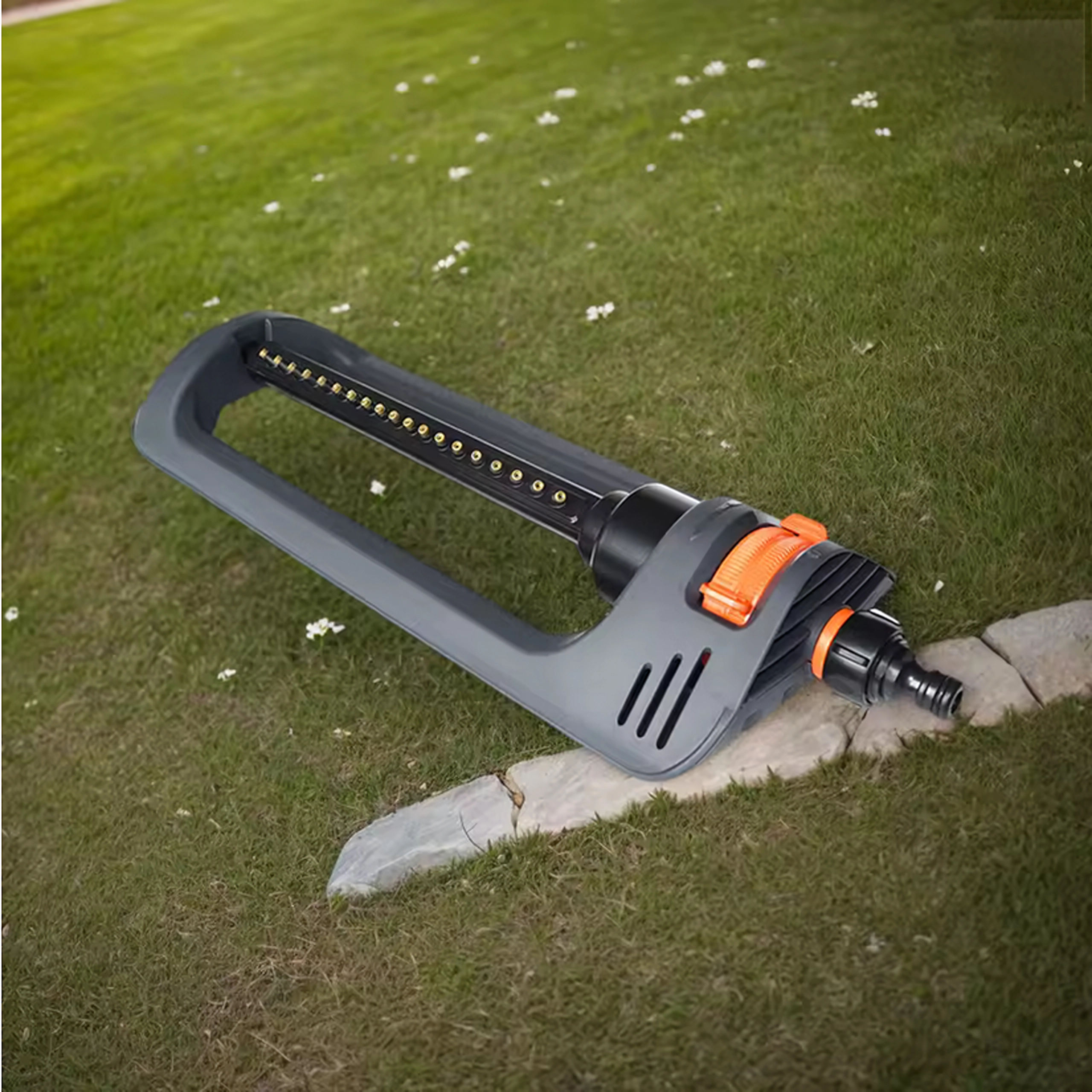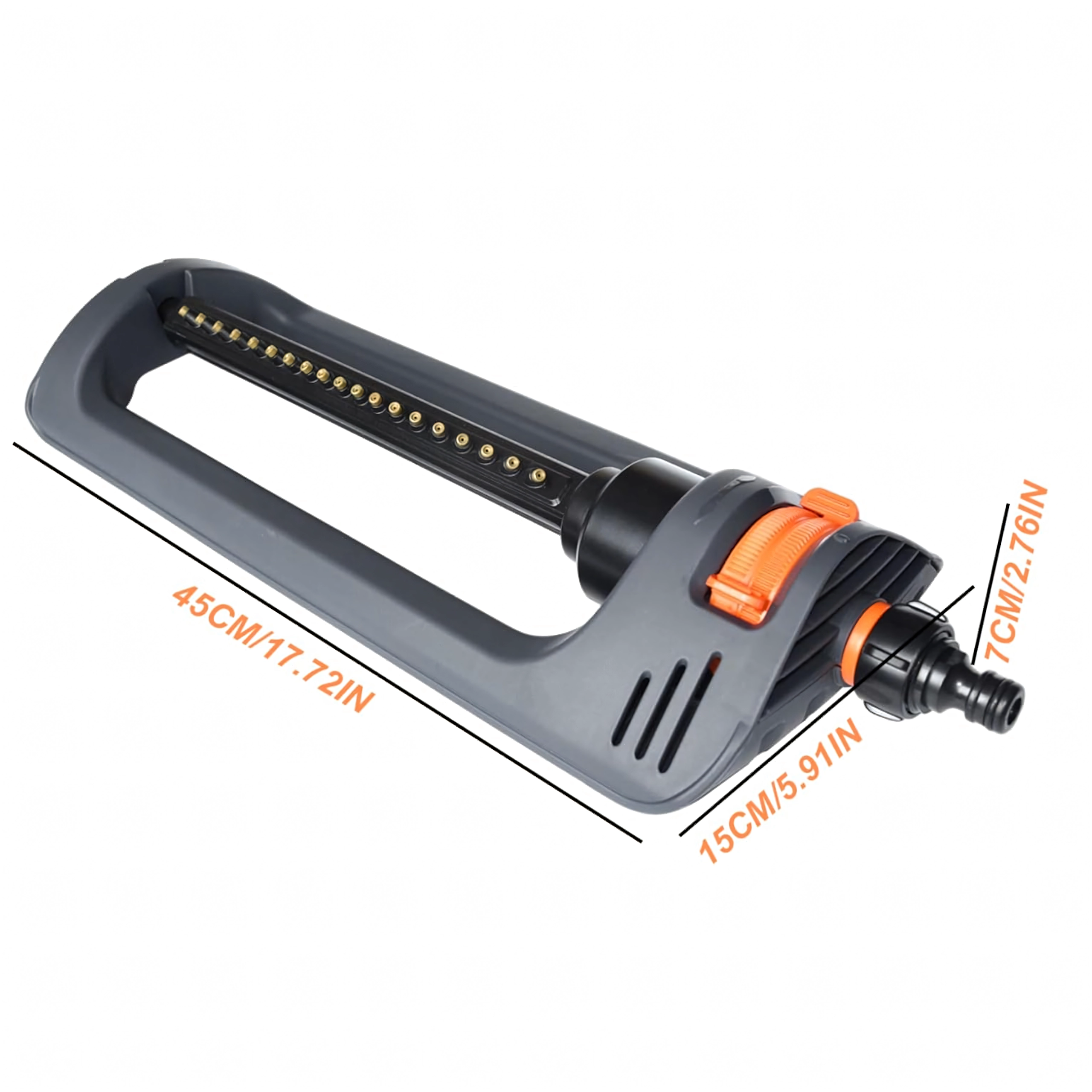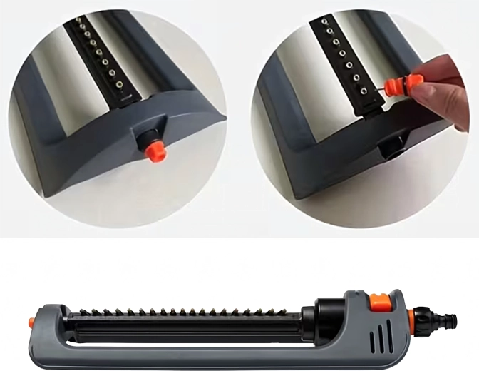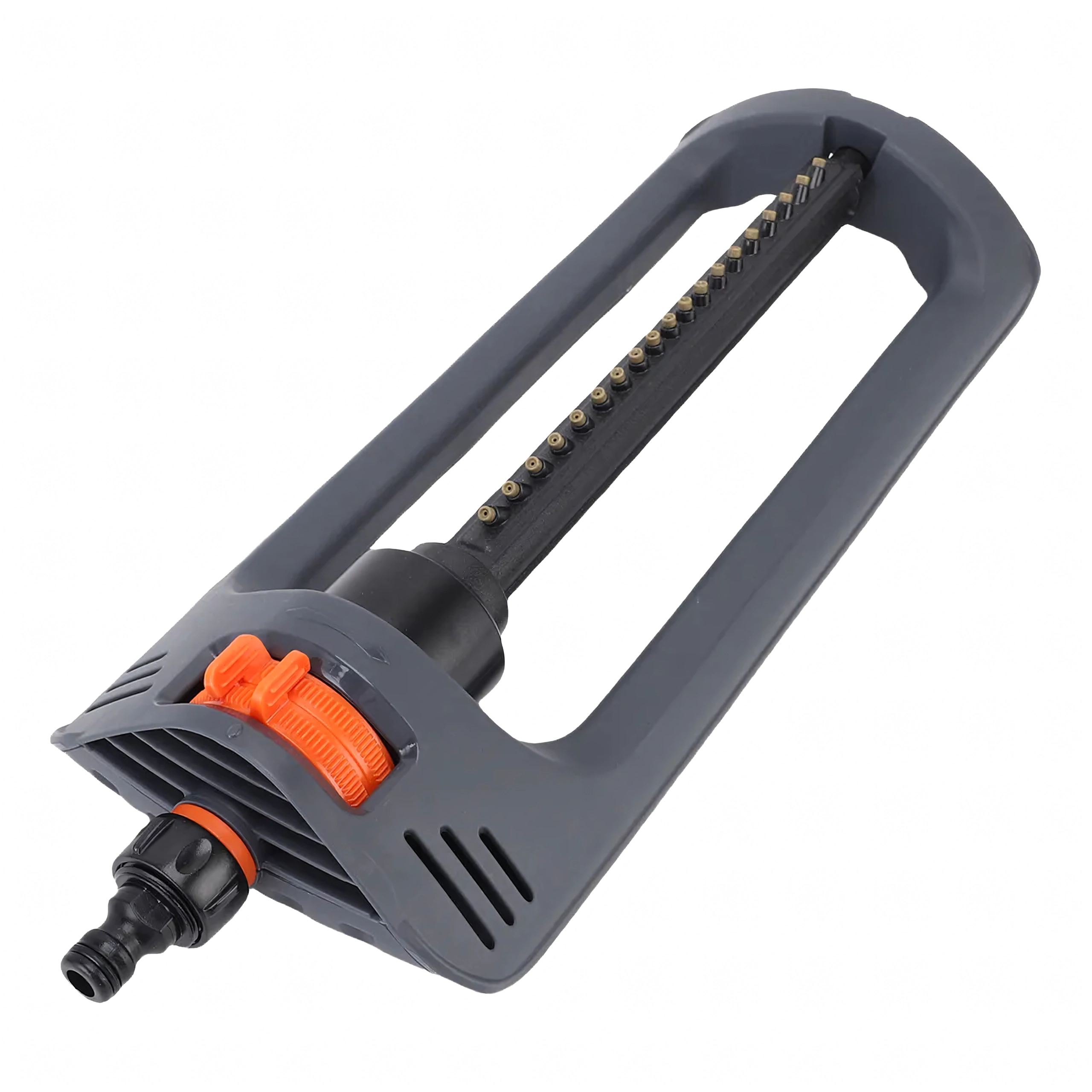 Wytrzymała konstrukcja ze stabilną niskoprofilową ramą utrzymuje zraszacz pewnie na miejscu, a szybkozłączka ułatwia podłączenie do standardowego węża ogrodowego. Elementy sterujące w wyrazistym kolorze zapewniają szybkie i intuicyjne ustawienie przepływu oraz szerokości zraszania.
