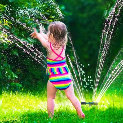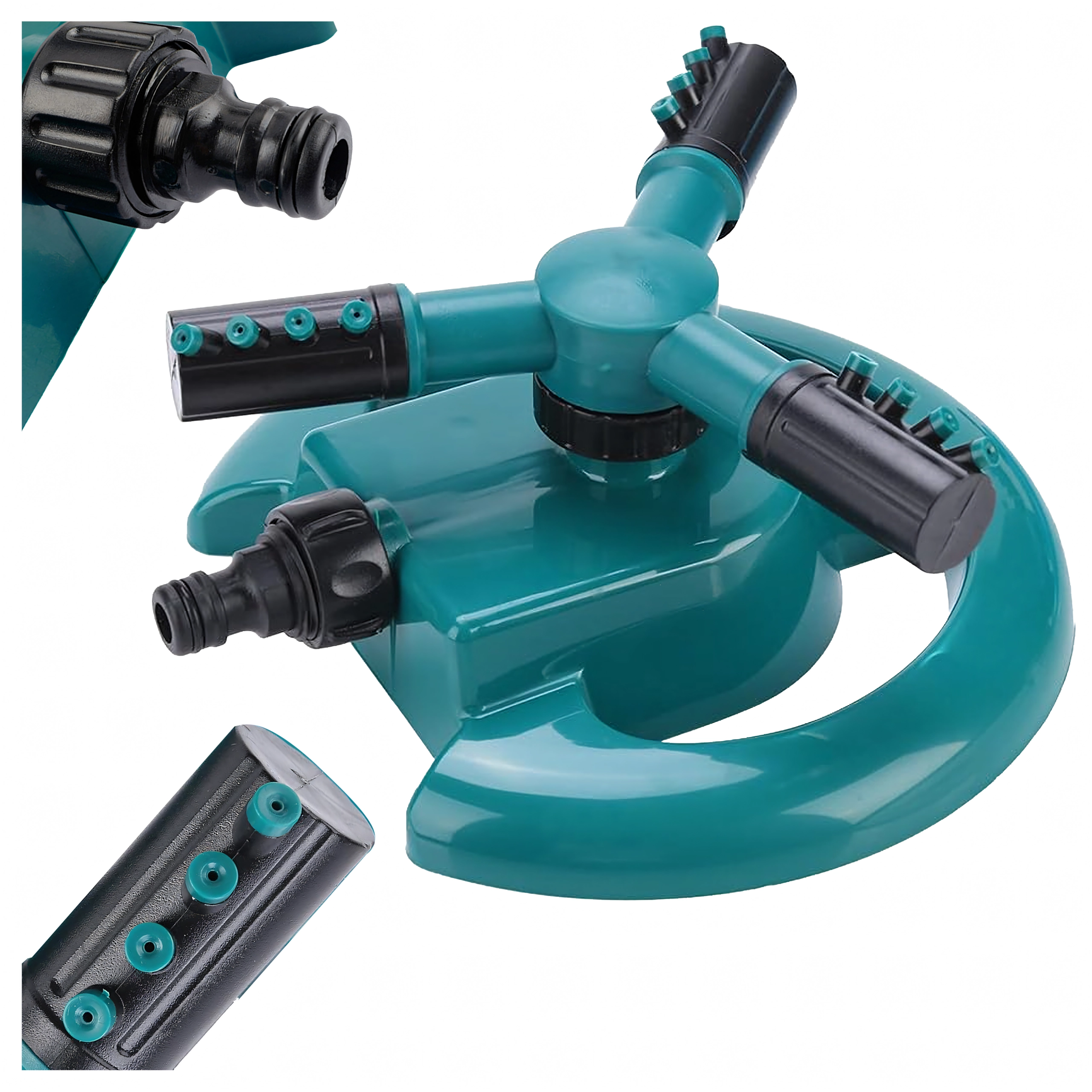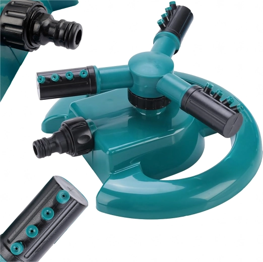 Praktyczny ogrodowy zraszacz z trójramienną głowicą zapewnia równomierne nawadnianie trawnika i rabat. Dzięki obrotowi 360° oraz regulowanym dyszom pokrywa szeroki obszar, jest stabilny, łatwo podłącza się do standardowego węża ogrodowego i oszczędza czas oraz wodę.